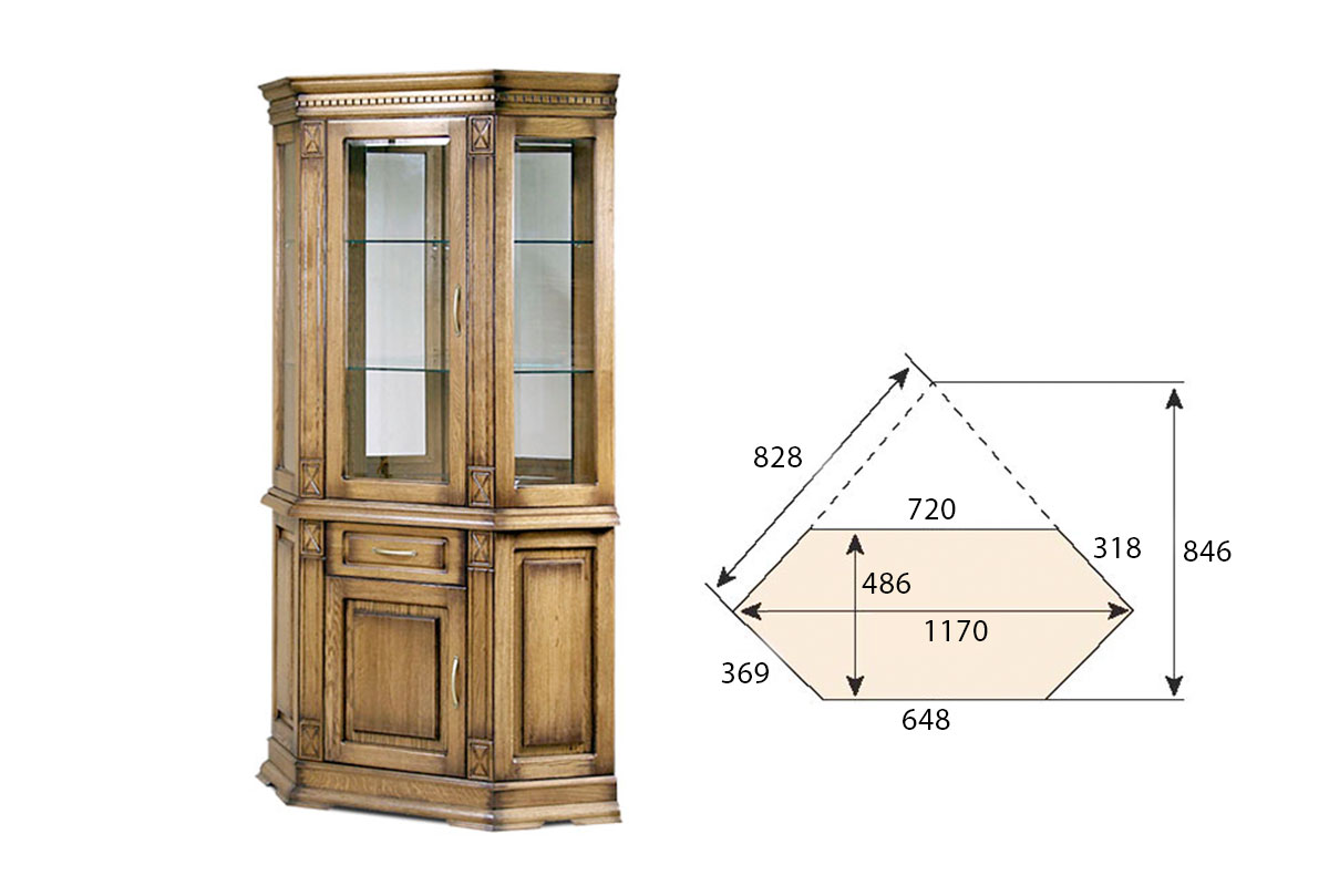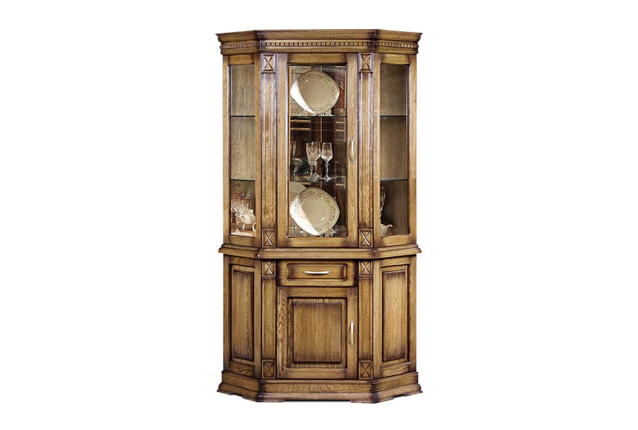 Угловой шкаф из коллекции «Верди» - это стильное решение для интерьера, оформленного в классическом стиле. Стеклянные фасады в сочетании с зеркальными полками и задней стенкой создадут красивую игру света. Благодаря этому, хрустальные бокалы, которые Вы можете поставить на полки, заиграют новыми красками. В выдвижном ящике и нише за дверцей Вы сможете спрятать личные вещи и легко поддерживать порядок в комнате. Декоративные элементы в виде резных пилястр и фигурного цоколя придают шкафу торжественности и утонченности, свойственных классике.
