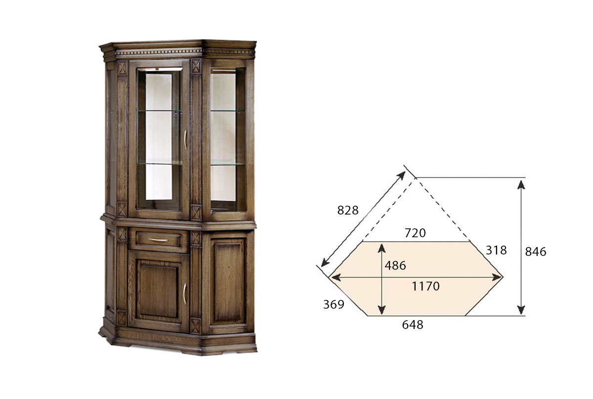 Угловой шкаф из коллекции «Верди» - это стильное решение для интерьера, оформленного в классическом стиле. Стеклянные фасады в сочетании с зеркальными полками и задней стенкой создадут красивую игру света. Благодаря этому, хрустальные бокалы, которые Вы можете поставить на полки, заиграют новыми красками. В выдвижном ящике и нише за дверцей Вы сможете спрятать личные вещи и легко поддерживать порядок в комнате. Декоративные элементы в виде резных пилястр и фигурного цоколя придают шкафу торжественности и утонченности, свойственных классике.
