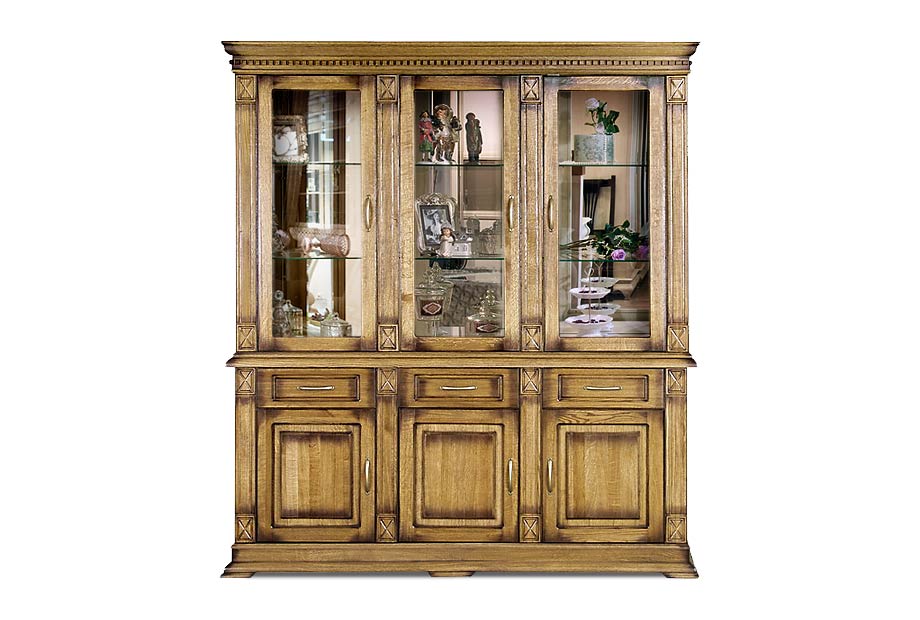 Большой комбинированный шкаф из коллекции «Верди Люкс» - это стильное решение для интерьера, оформленного в классическом стиле. Стеклянные фасады в сочетании с зеркальными полками и задней стенкой создадут красивую игру света. Благодаря этому, хрустальные бокалы, которые Вы можете поставить на полки, заиграют новыми красками. В выдвижных ящиках и нишах за дверцами Вы сможете спрятать личные вещи и легко поддерживать порядок в комнате. Декоративные элементы в виде резных пилястр и фигурного цоколя придают шкафу торжественности и утонченности, свойственных классике.