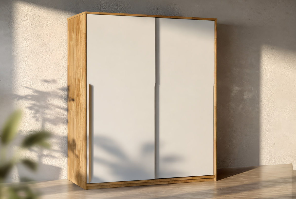 Двухдверный шкаф-купе для одежды Уоллстрит в цвете «к-бейц-масло, ф-белый» с сочетанием текстуры натурального дерева и акцентных фасадов. Шкаф собрал в себе черты современного стиля. Сдержанно-светлая цветовая гамма, упорядоченность внутреннего пространства шкафа. Шкаф-купе для одежды Wallstreet благодаря светлым цветам отлично сочетается с другими элементами интерьера спальни, детской, гостиной или прихожей. Высокий шкаф-купе - это разумное и функциональное использование пространства.