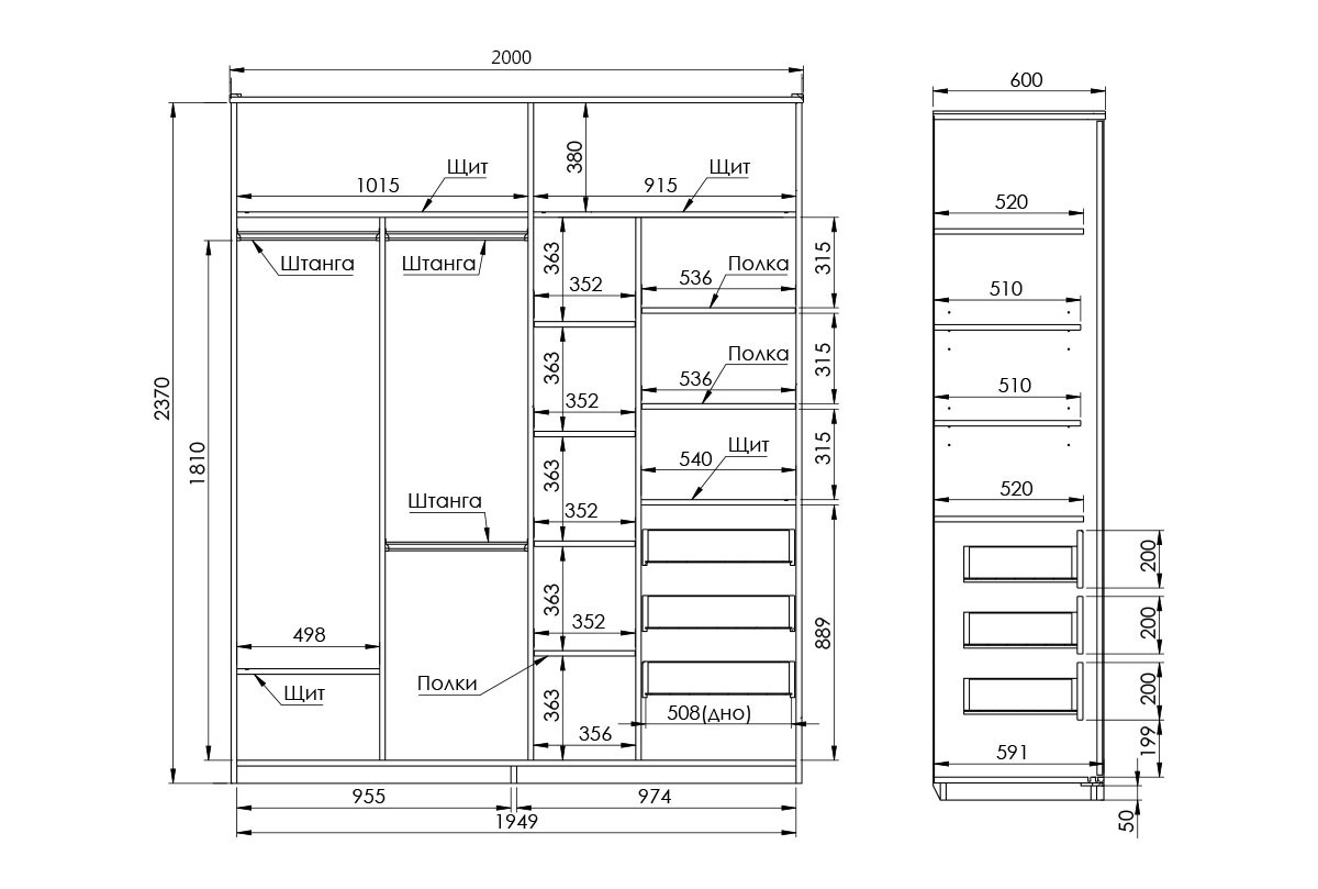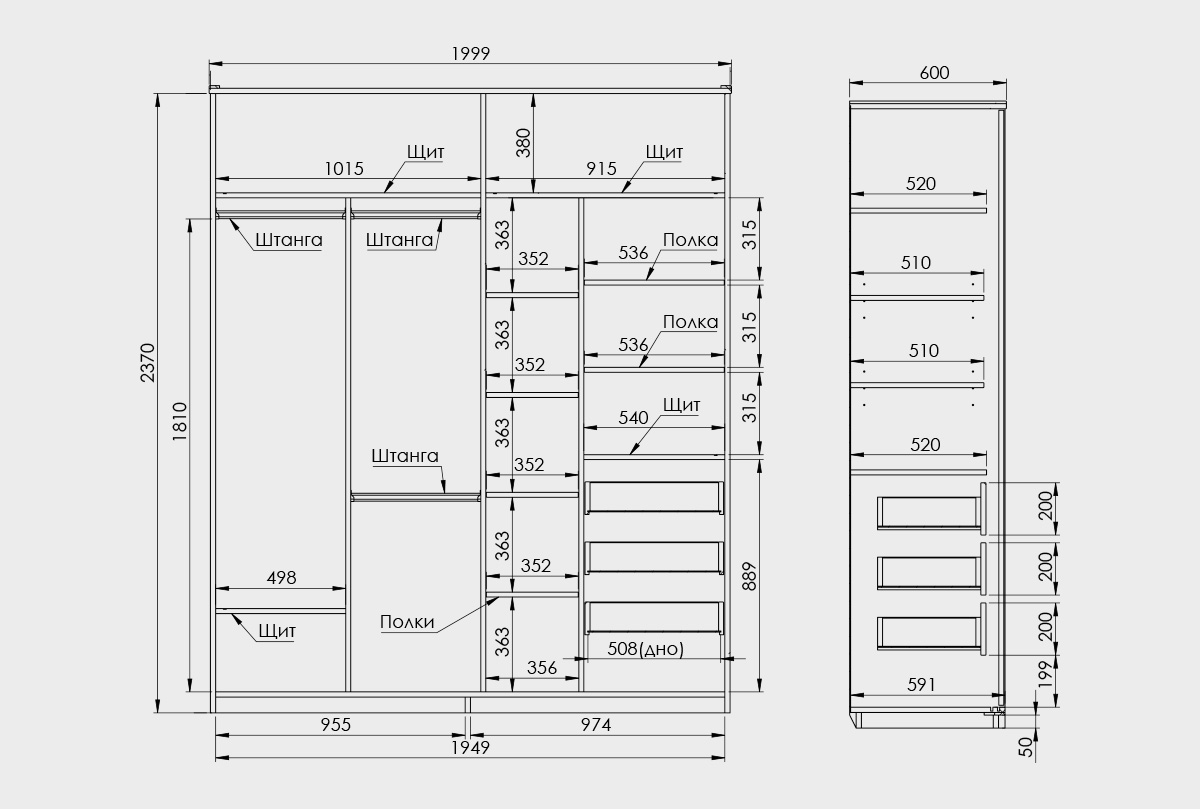✅ Размер шкафа для одежды: ширина 2000 мм, высота 2410 мм, глубина 600 мм.