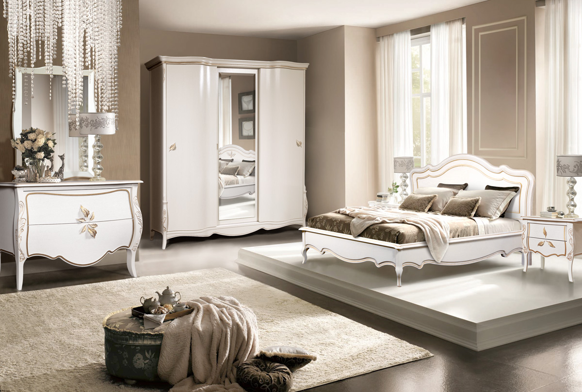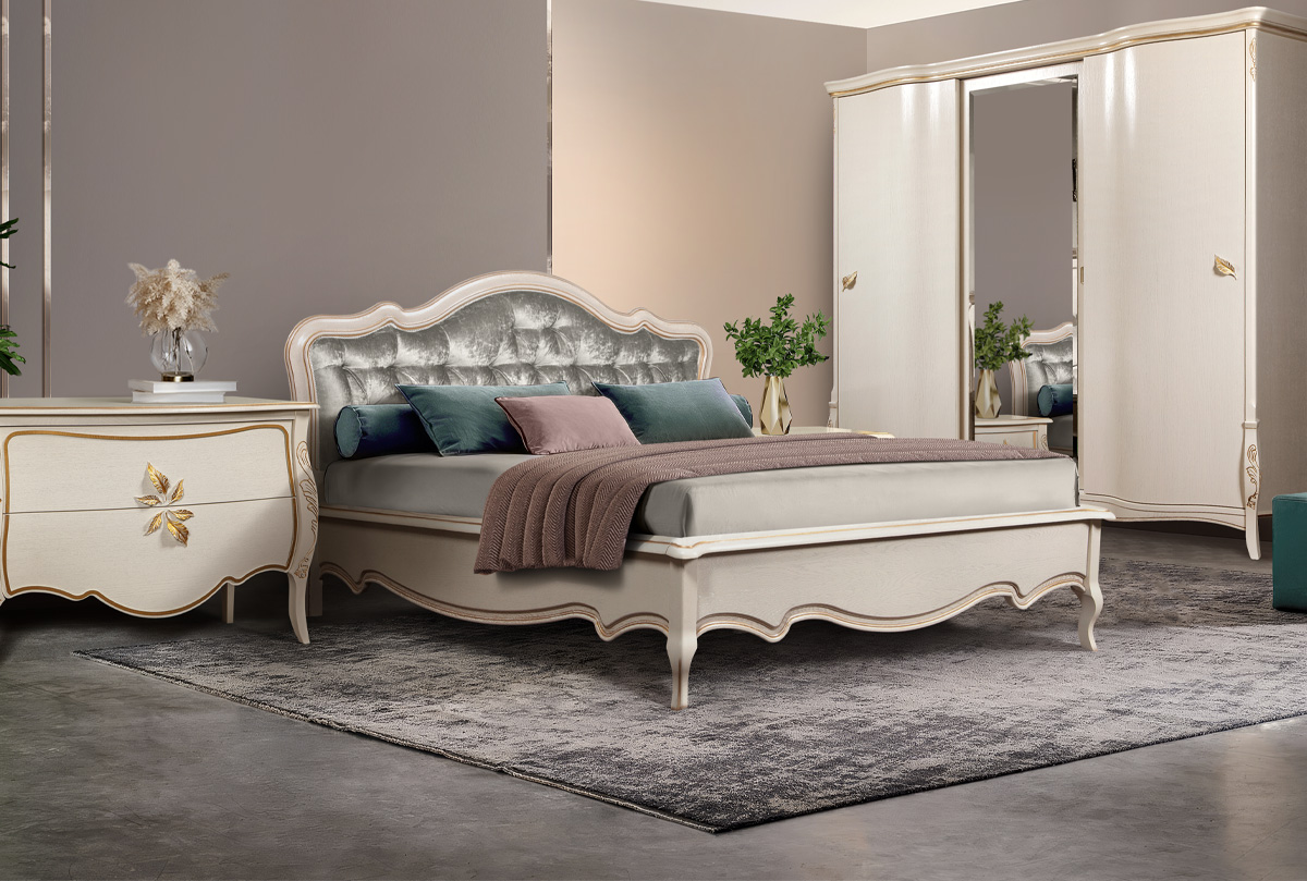 Благодаря своим размерам шкаф-купе из коллекции «Трио» в цвете «белая эмаль с золотой патиной» позволит разместить гардероб всей семьи. В боковых секциях расположены две полки и штанги для одежды, куда можно повесить платья, костюмы и длинную верхнюю одежду, а в центральной – штанга для плечиков и три полки, на которых Вы сможете сложить футболки, джемпера и джинсы. Бесшумные двери-купе делают этот шкаф идеальным для спальни: ни один шум не разбудит Вас утром. Несмотря на свои внушительные размеры, этот шкаф Trio выглядит изящно и утонченно благодаря волнистой «юбке» и фурнитуре в виде лепестков. Благородные оттенки крашения «коньяк с серебряной патиной», «белая эмаль с золотой патиной» и «белая эмаль с серебряной патиной» гармонично дополняют «образ» и делают это изделие универсальным и подходящим практически к любому интерьеру.