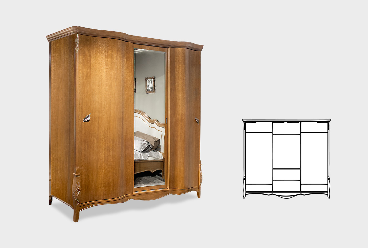 Благодаря своим размерам шкаф-купе из коллекции «Трио» в цвете «коньяк с серебряной патиной+серебро» позволит разместить гардероб всей семьи. В боковых секциях расположены две полки и штанги для одежды, куда можно повесить платья, костюмы и длинную верхнюю одежду, а в центральной – штанга для плечиков и три полки, на которых Вы сможете сложить футболки, джемпера и джинсы. Бесшумные двери-купе делают этот шкаф идеальным для спальни: ни один шум не разбудит Вас утром. Несмотря на свои внушительные размеры, этот шкаф Trio выглядит изящно и утонченно благодаря волнистой «юбке» и фурнитуре в виде лепестков. Благородные оттенки крашения «коньяк с серебряной патиной», «белая эмаль с золотой патиной» и «белая эмаль с серебряной патиной» гармонично дополняют «образ» и делают это изделие универсальным и подходящим практически к любому интерьеру.