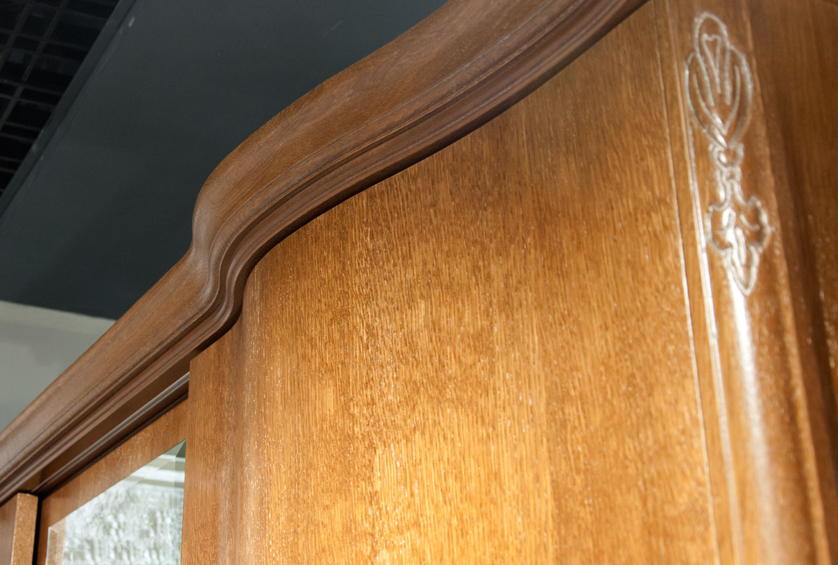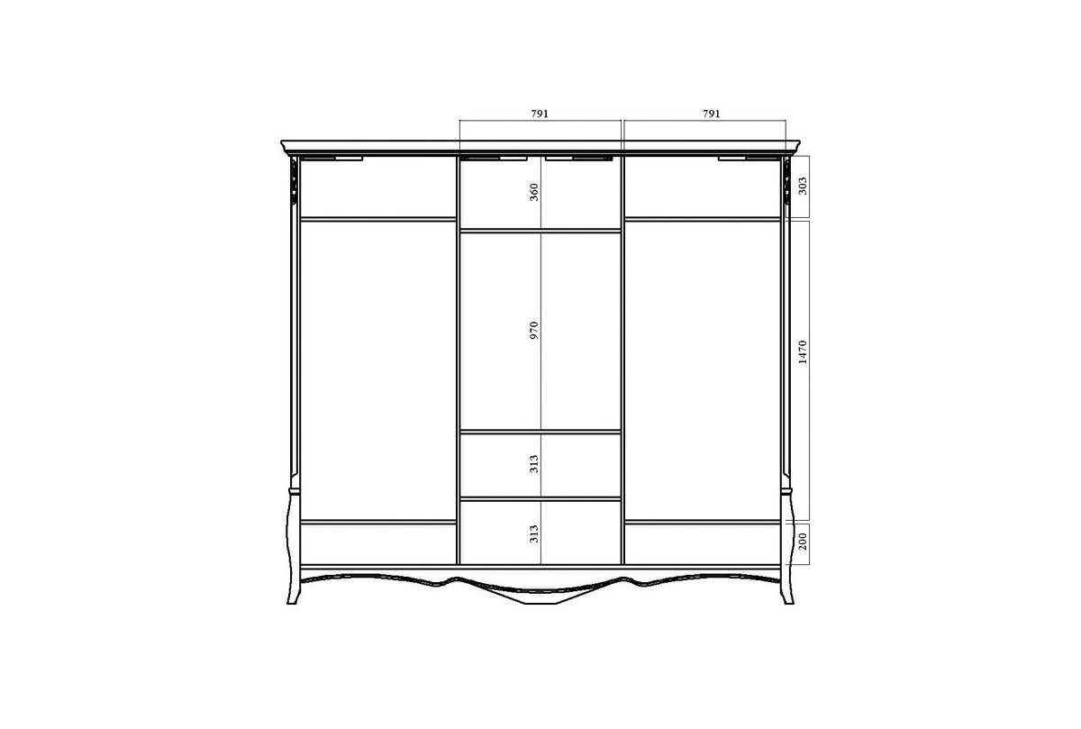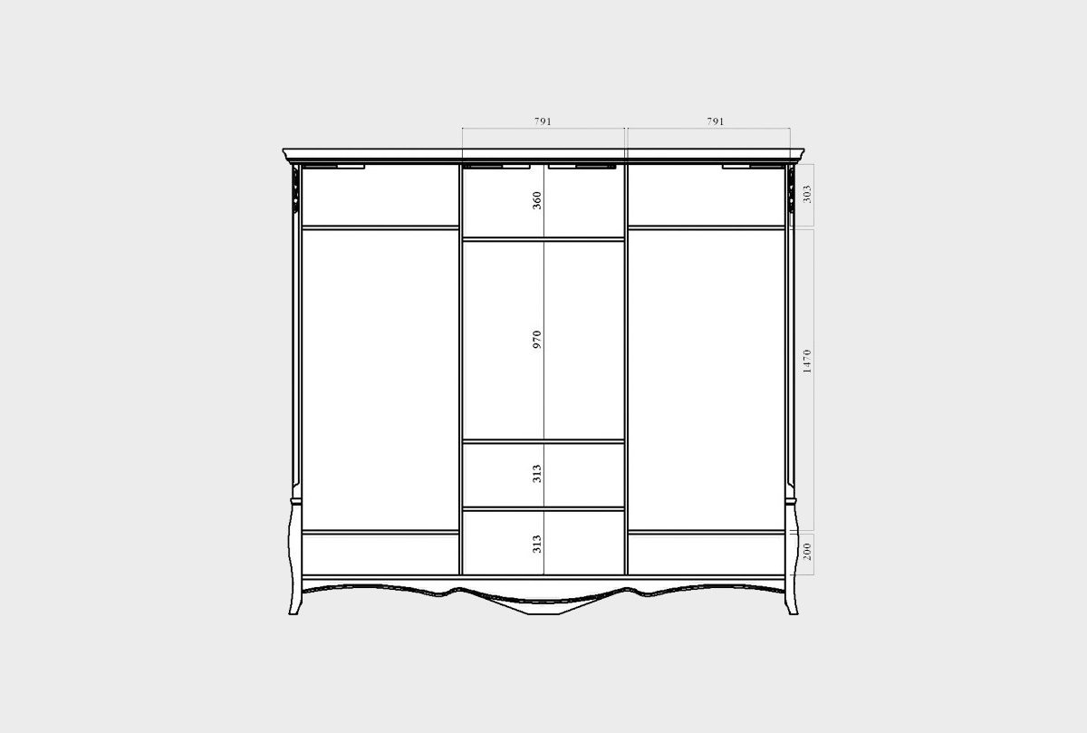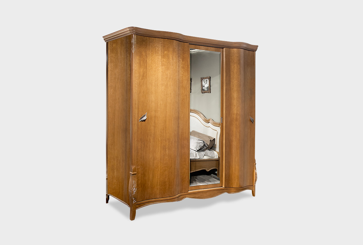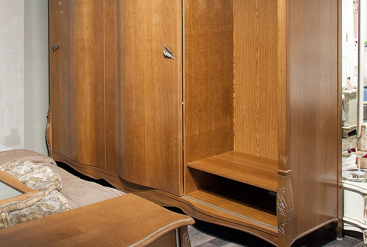 Благодаря своим размерам шкаф-купе из коллекции «Трио» в цвете «коньяк с серебряной патиной+серебро» позволит разместить гардероб всей семьи. В боковых секциях расположены две полки и штанги для одежды, куда можно повесить платья, костюмы и длинную верхнюю одежду, а в центральной – штанга для плечиков и три полки, на которых Вы сможете сложить футболки, джемпера и джинсы. Бесшумные двери-купе делают этот шкаф идеальным для спальни: ни один шум не разбудит Вас утром. Несмотря на свои внушительные размеры, этот шкаф Trio выглядит изящно и утонченно благодаря волнистой «юбке» и фурнитуре в виде лепестков. Благородные оттенки крашения «коньяк с серебряной патиной», «белая эмаль с золотой патиной» и «белая эмаль с серебряной патиной» гармонично дополняют «образ» и делают это изделие универсальным и подходящим практически к любому интерьеру.