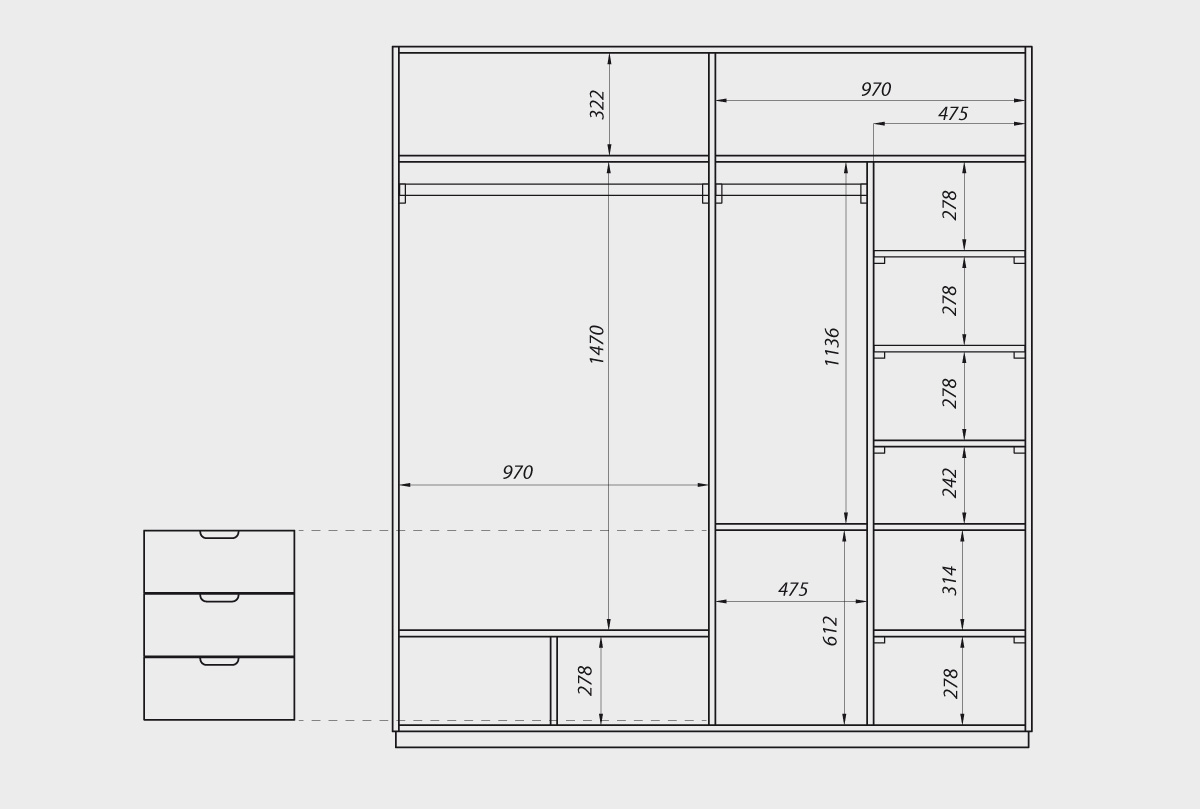 ✅ Шкаф продуман до мелочей и делится на три основные функциональные зоны, что позволяет разместить в нем одежду на вешалках, сложенную одежду, сумки и коробки.
