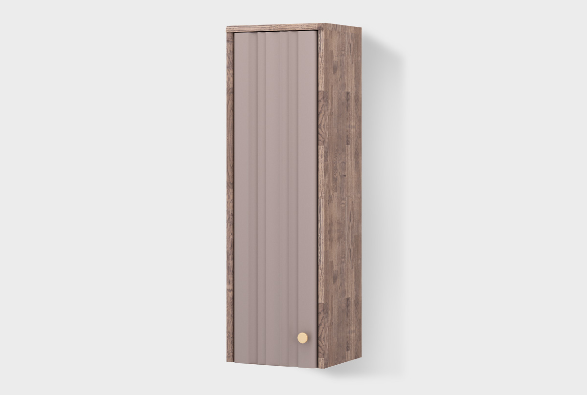 Шкаф настенный «Меридиан» (левый) изготовлен из дуба. Корпус выполнен в цвете «торфяной дуб», а фасад — в оттенке «нирвана».