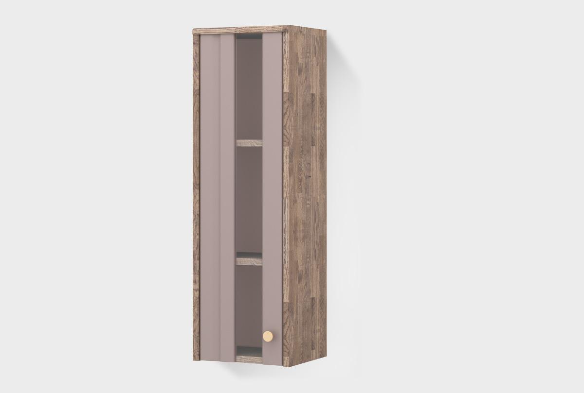 Шкаф настенный «Меридиан» (левый) со стеклянной вставкой в дверце, изготовлен из дуба. Корпус выполнен в цвете «торфяной дуб», а фасад — в оттенке «нирвана».