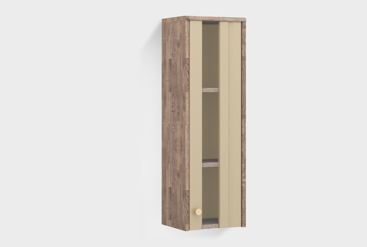 Шкаф настенный «Меридиан» стекло (правый), изготовлен из дуба. Корпус выполнен в цвете «торфяной дуб», а фасад — в оттенке «мускат».
