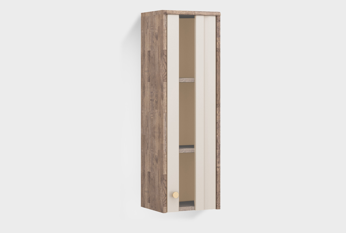 Шкаф настенный «Меридиан» (правый) со стеклянной вставкой в дверце, изготовлен из дуба. Корпус выполнен в цвете «торфяной дуб», а фасад — в оттенке «панна котта».