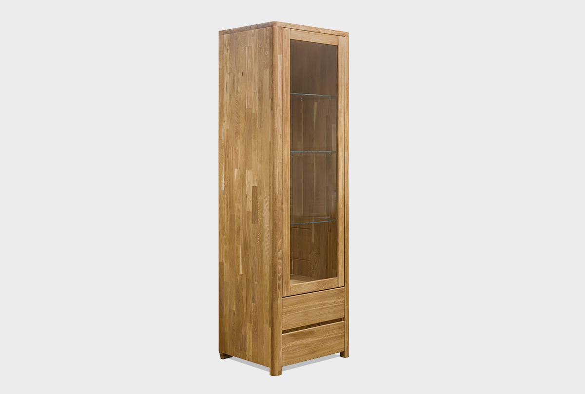 Левый однодверный шкаф с витриной «Норд» в цвете «бейц-масло» отлично дополнит Вашу гостиную и станет незаменимым помощником в вопросе хранения вещей: два выдвигающихся ящика прекрасно подойдут как для мелочей, так и для салфеток, скатертей и другого домашнего текстиля, а три стеклянные полки с легкостью вместят Ваш семейный сервиз. Массив дуба делает шкаф основательным и прочным, а покрытие бейц-маслом подчеркивает древесную фактуру изделия и сохраняет ее в первозданном виде.