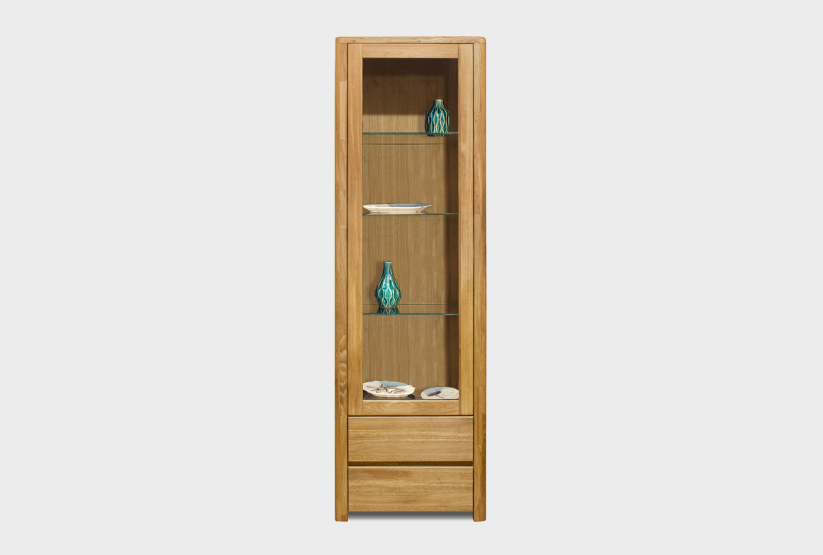Правый однодверный шкаф с витриной «Норд» в цвете «бейц-масло» отлично дополнит Вашу гостиную и станет незаменимым помощником в вопросе хранения вещей: два выдвигающихся ящика прекрасно подойдут как для мелочей, так и для салфеток, скатертей и другого домашнего текстиля, а три стеклянные полки с легкостью вместят Ваш семейный сервиз. Массив дуба делает шкаф основательным и прочным, а покрытие бейц-маслом подчеркивает древесную фактуру изделия и сохраняет ее в первозданном виде.