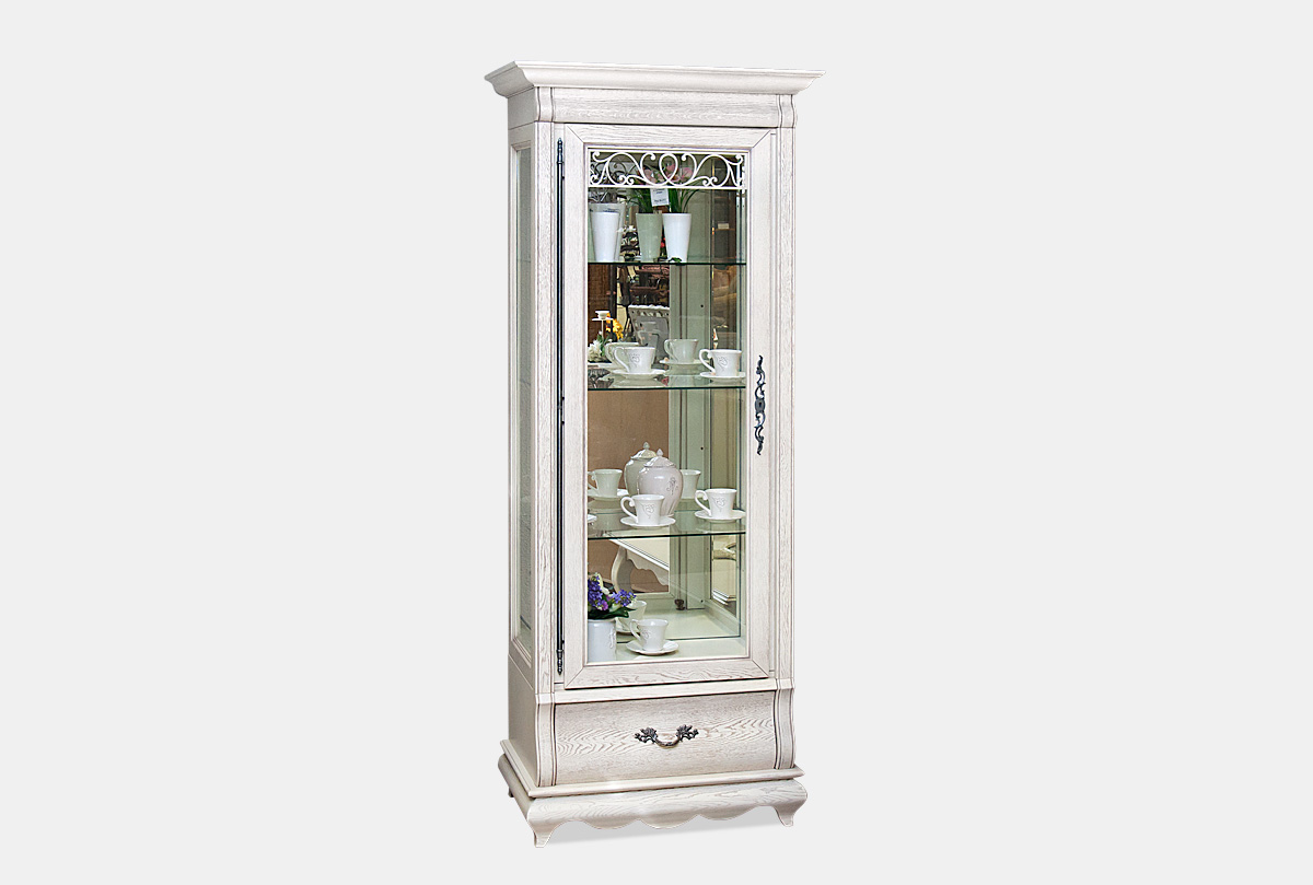 Левый однодверный шкаф с витриной «Тэфи» в цвете «белая эмаль с темной патиной» демонстрирует ясные гармоничные пропорции, при этом его вид достаточно компактен. Благодаря внутренней подсветке помещенные в шкаф изысканные сервизы заиграют всеми гранями, а на фоне деликатного велюра, которым обита внутренняя поверхность ящиков, сиянье столовых приборов станет еще ярче. Для того, чтобы оптимально разместить шкаф с витриной в вашем интерьере, выберите нужное вам исполнение (правое или левое).
