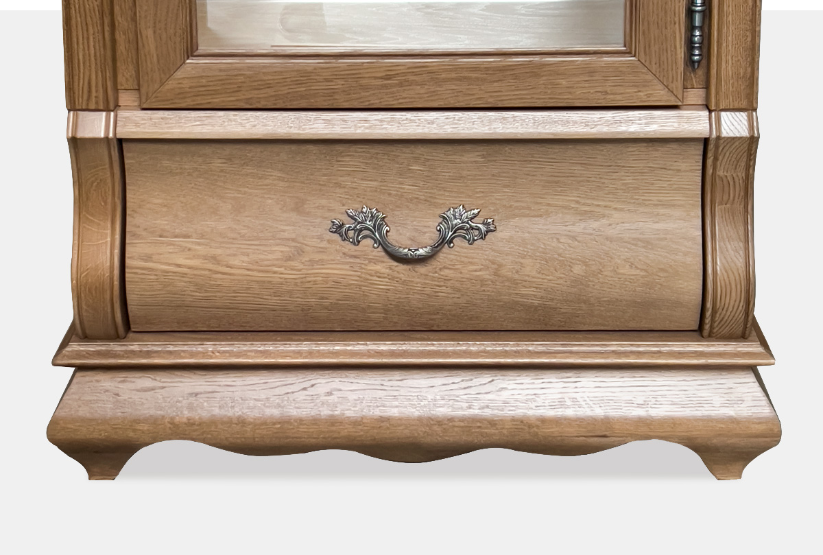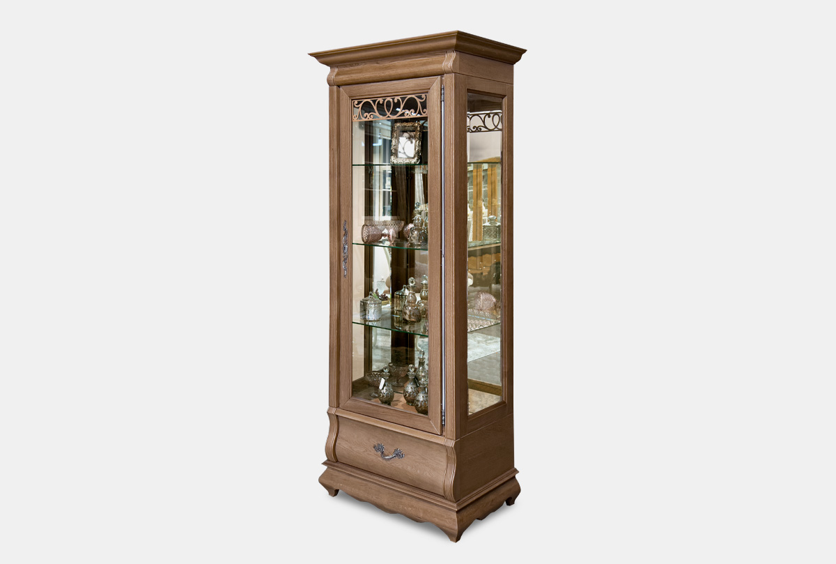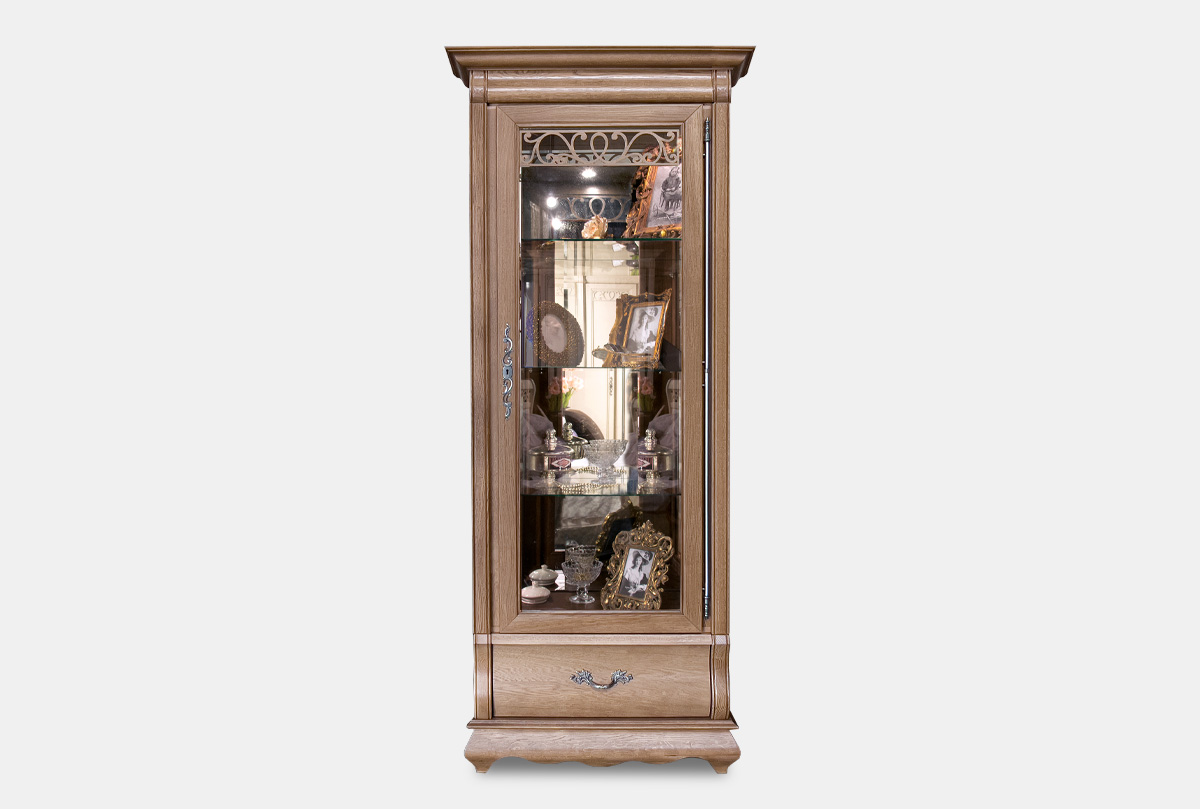 Правый однодверный шкаф с витриной «Тэфи» в цвете «классик» демонстрирует ясные гармоничные пропорции, при этом его вид достаточно компактен. Благодаря внутренней подсветке помещенные в шкаф изысканные сервизы заиграют всеми гранями, а на фоне деликатного велюра, которым обита внутренняя поверхность ящиков, сиянье столовых приборов станет еще ярче. Для того, чтобы оптимально разместить шкаф с витриной в вашем интерьере, выберите нужное вам исполнение (правое или левое).