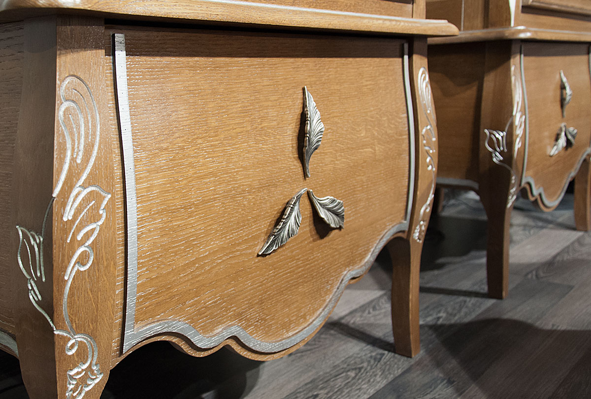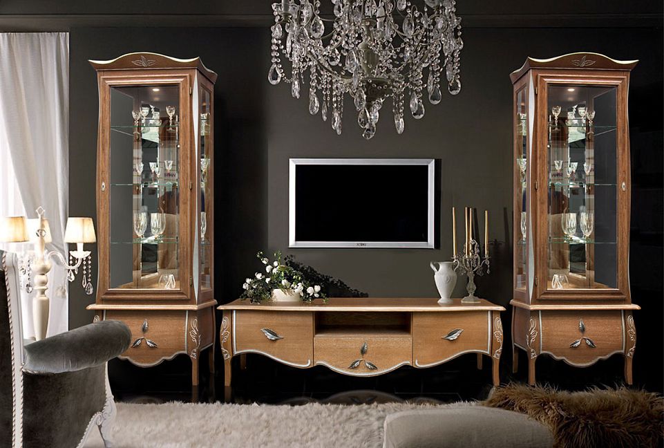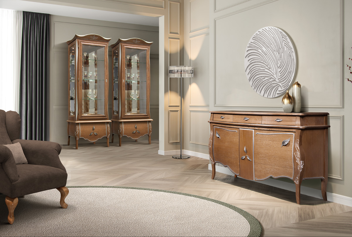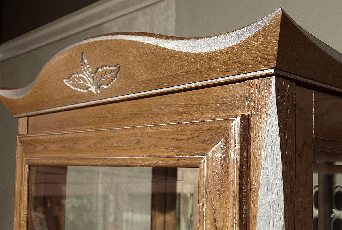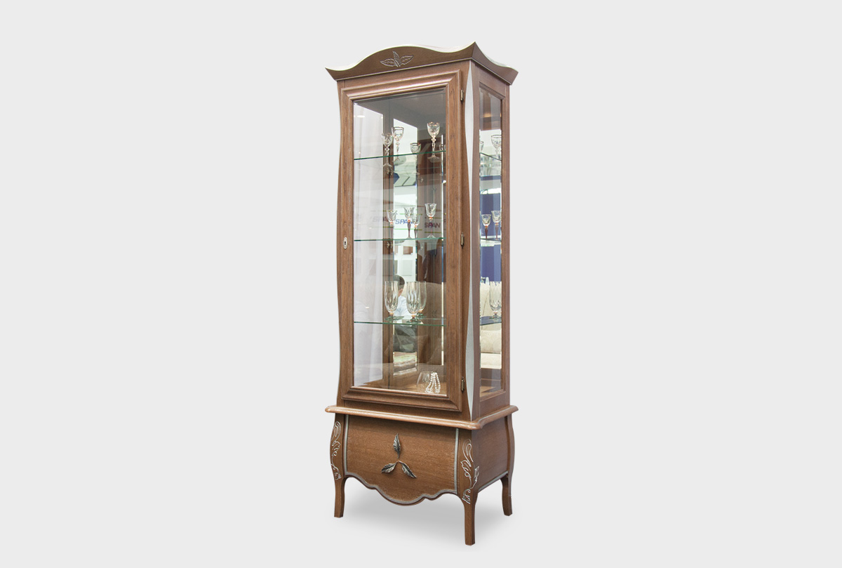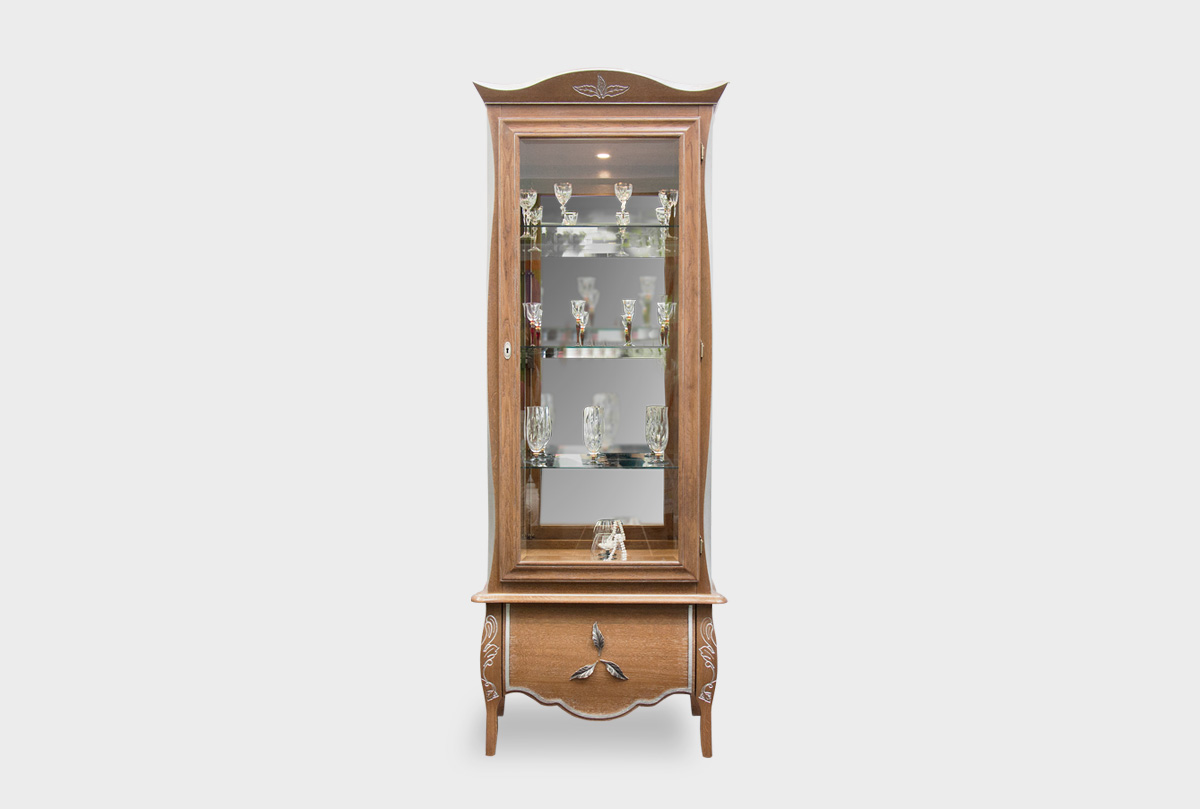 Однодверный правый шкаф с витриной из коллекции «Трио» в цвете «коньяк с серебряной патиной+серебро» из массива и шпона дуба порадует любителей основательных и массивных форм, но в то же время – изящества и декоративности. Изделие идеально сочетает в себе эстетику и практичность и идеально впишется как в гостиную, так и в столовую. В шкафу Вы можете хранить посуду, сувениры, расставить рамки с фотографиями или книги. Он оснащен подсветкой, которая красиво отражается в зеркальной задней поверхности, а стеклянные боковые стенки дополняют образ и делают его более легким и изящным.