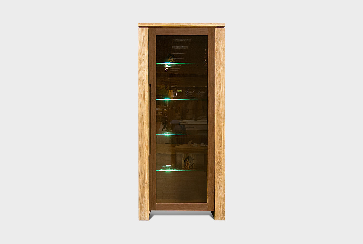 Левая однодверная витрина «Берген» (Bergen) в цвете «бейц-масло, графит», полки с подсветкой. Изделие выполнено из массива и натурального шпона дуба.