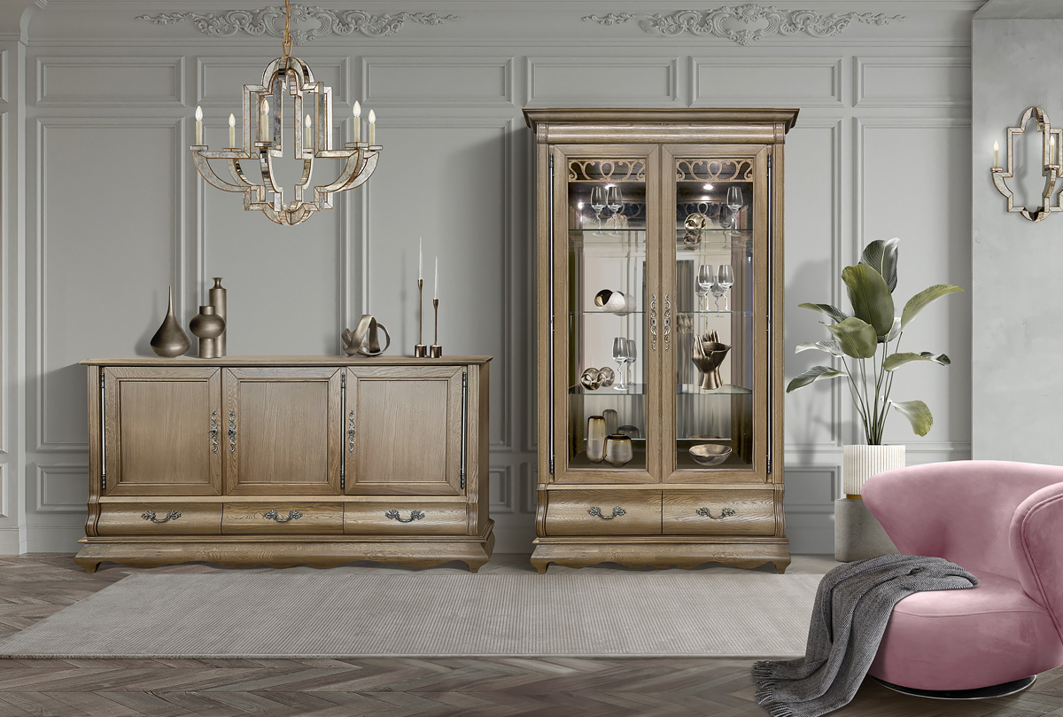 Изысканный вкус хозяев подчеркнет двухдверный шкаф с витриной «Тэфи» в цвете «классик». Этому элементу интерьера просто уготовано украсить гостиную или столовую. На его полках будет хорошо смотреться как дорогая фарфоровая посуда, так и вновь вошедший в моду хрусталь. А плотно закрывающаяся на ключ дверь защитит посуду от пыли. Для изготовления шкафа используется ценная порода дерева, а именно массив дуба. Деревянная накладная резьба продемонстрирует на стекле изящно прорисованные линии.