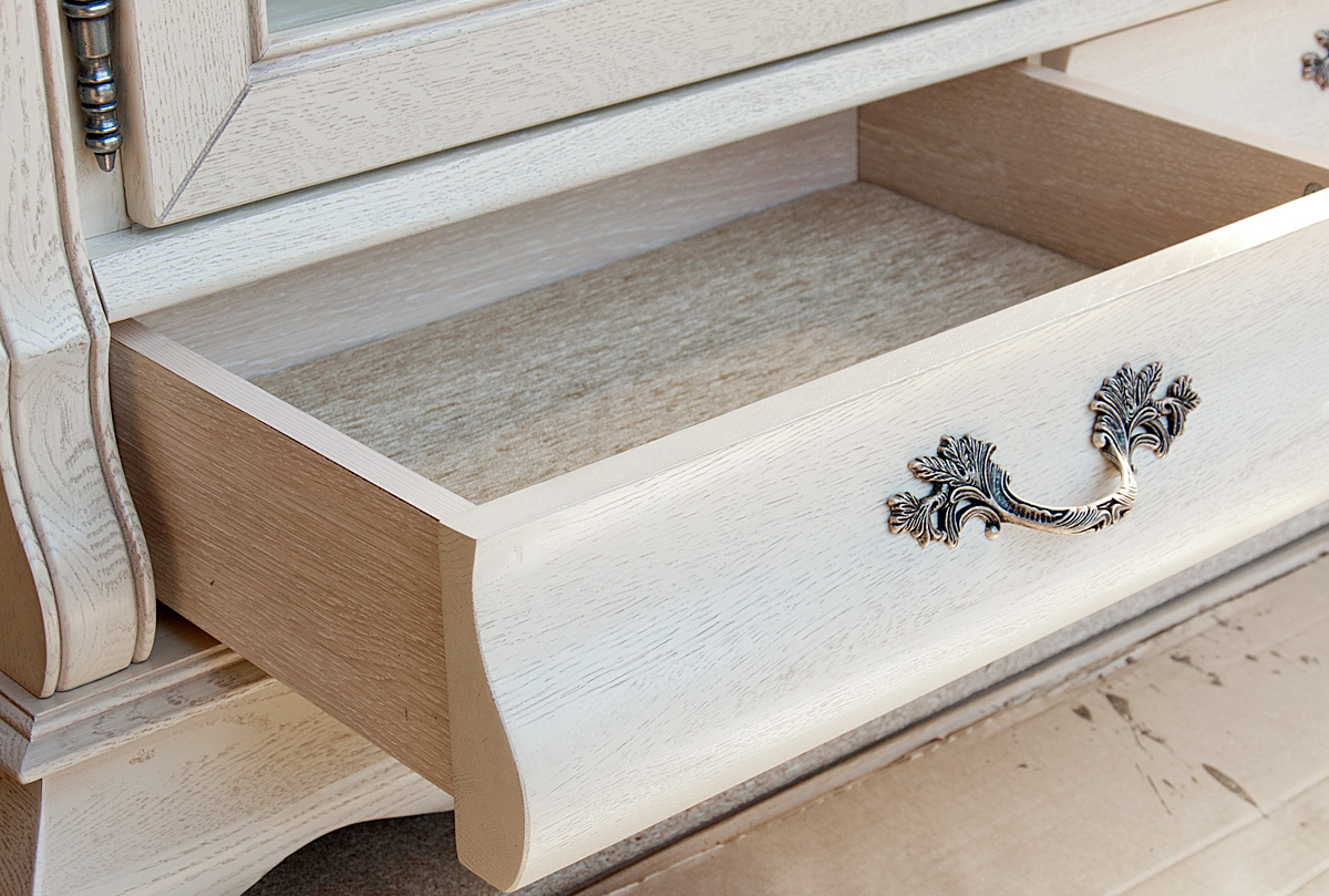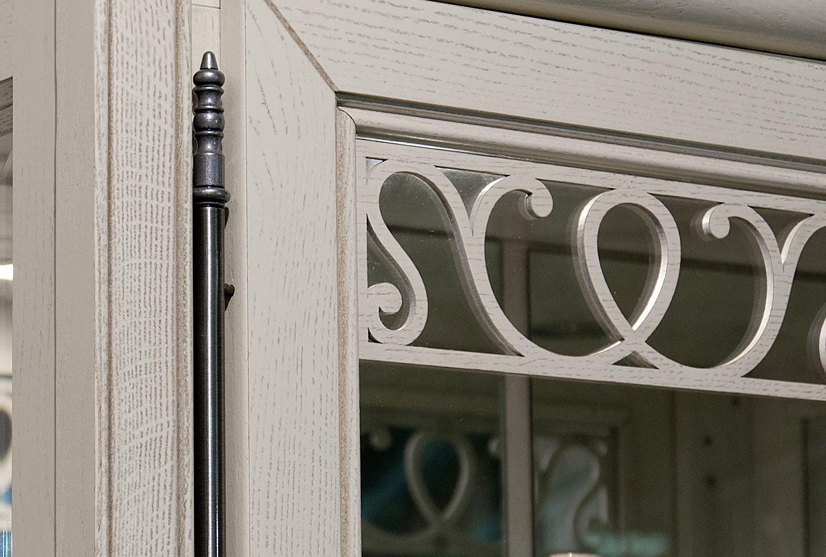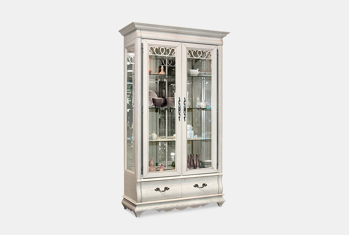 Изысканный вкус хозяев подчеркнет двухдверный шкаф с витриной «Тэфи» в цвете «белая эмаль с темной патиной». Этому элементу интерьера просто уготовано украсить гостиную или столовую. На его полках будет хорошо смотреться как дорогая фарфоровая посуда, так и вновь вошедший в моду хрусталь. А плотно закрывающаяся на ключ дверь защитит посуду от пыли. Для изготовления шкафа используется ценная порода дерева, а именно массив дуба. Деревянная накладная резьба продемонстрирует на стекле изящно прорисованные линии.