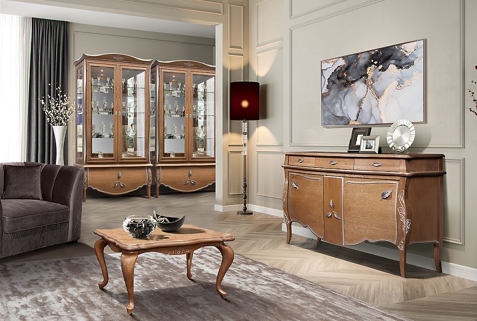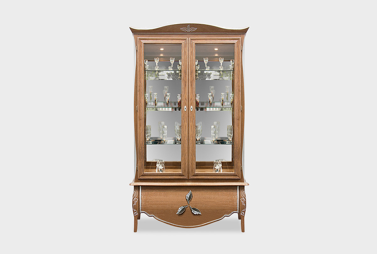 Двухдверный шкаф с витриной из коллекции «Трио» в цвете «коньяк с серебряной патиной+серебро» порадует любителей основательных и массивных форм, но в то же время – изящества и декоративности. Изделие идеально сочетает в себе эстетику и практичность и идеально впишется как в гостиную, так и в столовую. В шкафу Вы можете хранить посуду, сувениры, расставить рамки с фотографиями или книги. Он оснащен подсветкой, которая красиво отражается в зеркальной задней поверхности, а стеклянные боковые стенки дополняют образ и делают его более легким и изящным.