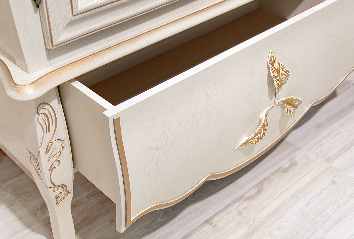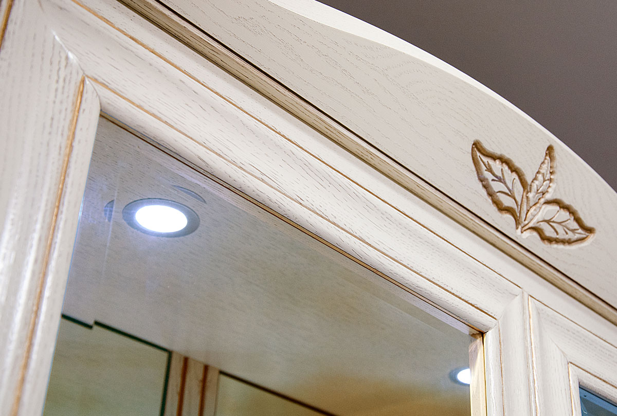 Двухдверный шкаф с витриной из коллекции «Трио» в цвете «белая эмаль с золотой патиной» порадует любителей основательных и массивных форм, но в то же время – изящества и декоративности. Изделие идеально сочетает в себе эстетику и практичность и идеально впишется как в гостиную, так и в столовую. В шкафу Вы можете хранить посуду, сувениры, расставить рамки с фотографиями или книги. Он оснащен подсветкой, которая красиво отражается в зеркальной задней поверхности, а стеклянные боковые стенки дополняют образ и делают его более легким и изящным.