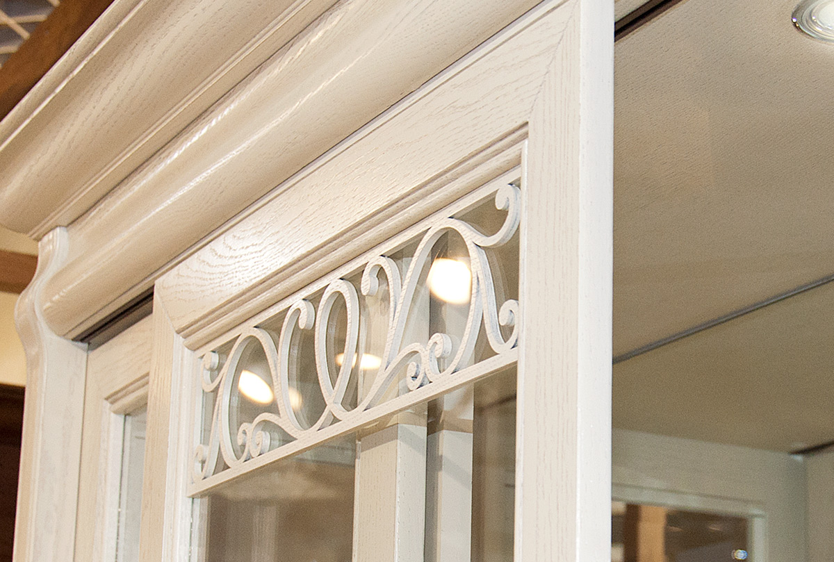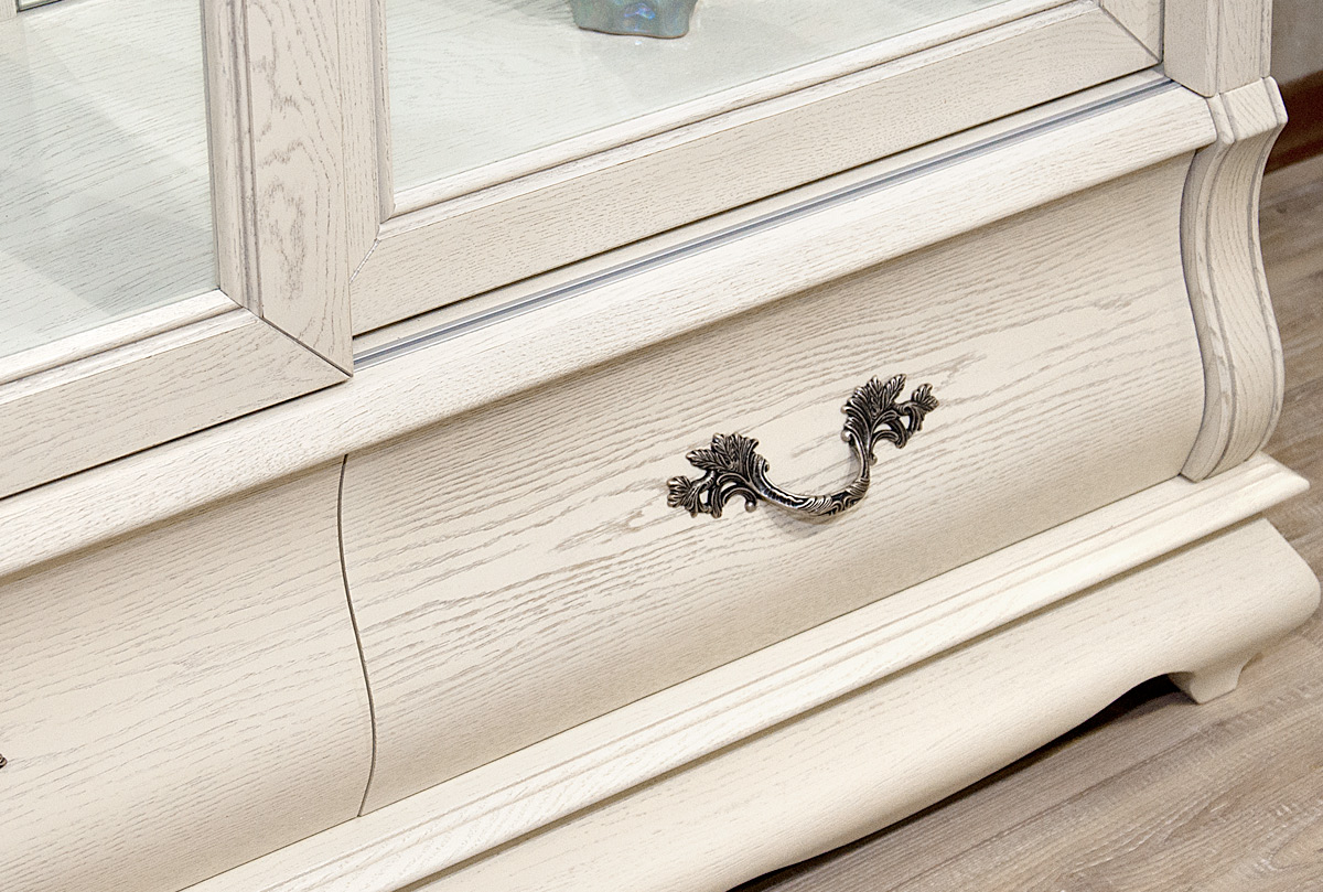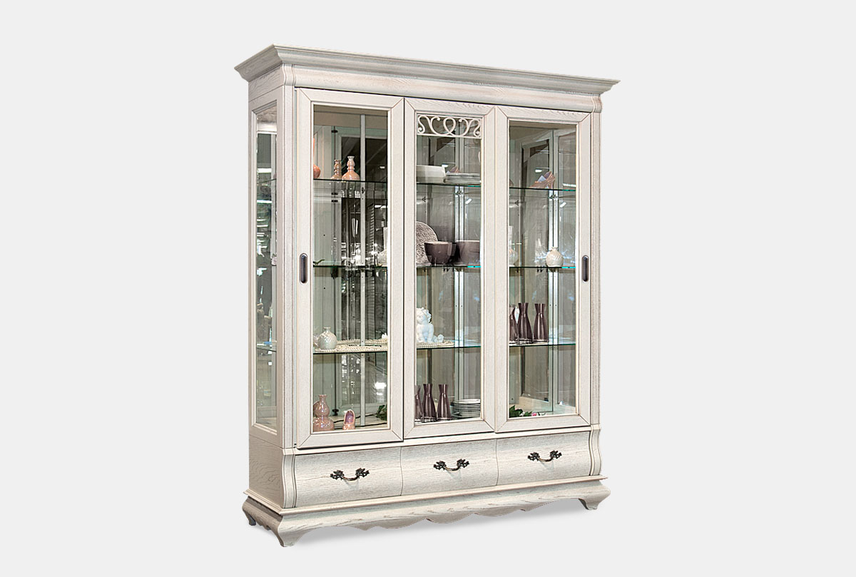 Изысканный вкус хозяев подчеркнет трехдверный шкаф-купе с витриной «Тэфи» в цвете «белая эмаль с темной патиной». Этому элементу интерьера просто уготовано украсить гостиную или столовую. На его полках будет хорошо смотреться как дорогая фарфоровая посуда, так и вновь вошедший в моду хрусталь. Для изготовления шкафа используется ценная порода дерева, а именно массив дуба и натуральный шпон дуба. Деревянная накладная резьба продемонстрирует на стекле изящно прорисованные линии. Цвет можно выбрать по своему вкусу: «белая эмаль с темной патиной» привнесёт элегантность, «классик» добавит нотки классицизма, а «амбэр с белой патиной» подарит оригинальность.