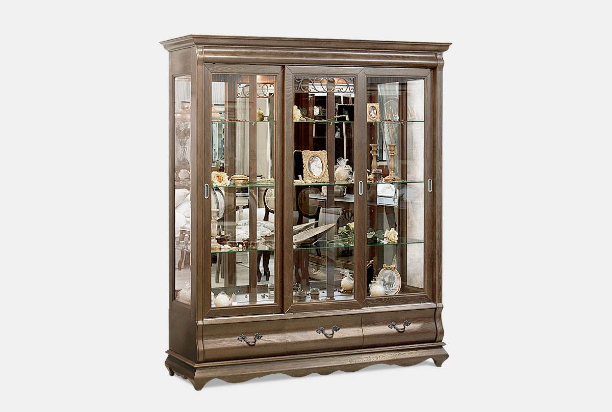 Изысканный вкус хозяев подчеркнет трехдверный шкаф-купе с витриной «Тэфи» в цвете «амбэр с белой патиной». Этому элементу интерьера просто уготовано украсить гостиную или столовую. На его полках будет хорошо смотреться как дорогая фарфоровая посуда, так и вновь вошедший в моду хрусталь. Для изготовления шкафа используется ценная порода дерева, а именно массив дуба и натуральный шпон дуба. Деревянная накладная резьба продемонстрирует на стекле изящно прорисованные линии. Цвет можно выбрать по своему вкусу: «белая эмаль с темной патиной» привнесёт элегантность, «классик» добавит нотки классицизма, а «амбэр с белой патиной» подарит оригинальность.