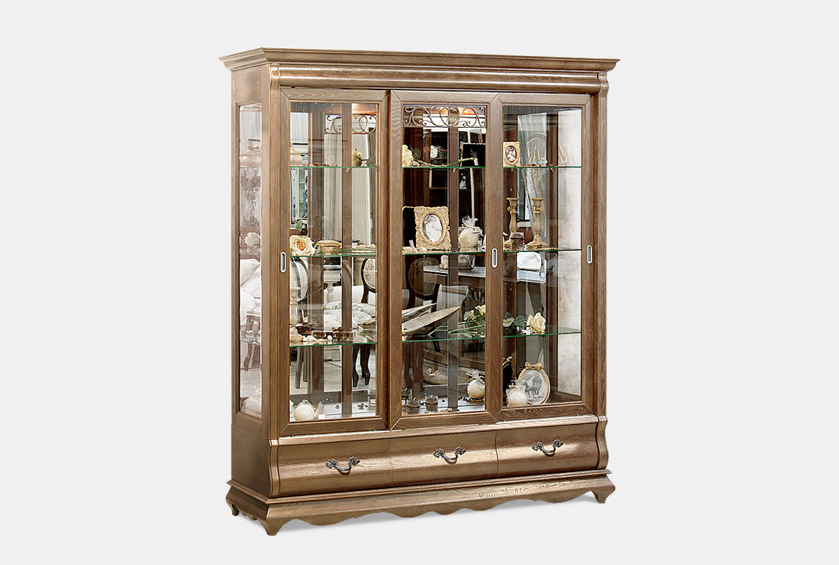 Изысканный вкус хозяев подчеркнет трехдверный шкаф-купе с витриной «Тэфи» в цвете «классик». Этому элементу интерьера просто уготовано украсить гостиную или столовую. На его полках будет хорошо смотреться как дорогая фарфоровая посуда, так и вновь вошедший в моду хрусталь. Для изготовления шкафа используется ценная порода дерева, а именно массив дуба и натуральный шпон дуба. Деревянная накладная резьба продемонстрирует на стекле изящно прорисованные линии. Цвет можно выбрать по своему вкусу: «белая эмаль с темной патиной» привнесёт элегантность, «классик» добавит нотки классицизма, а «амбэр с белой патиной» подарит оригинальность.