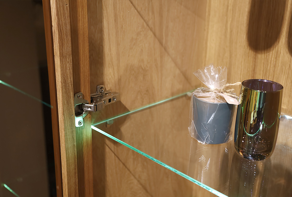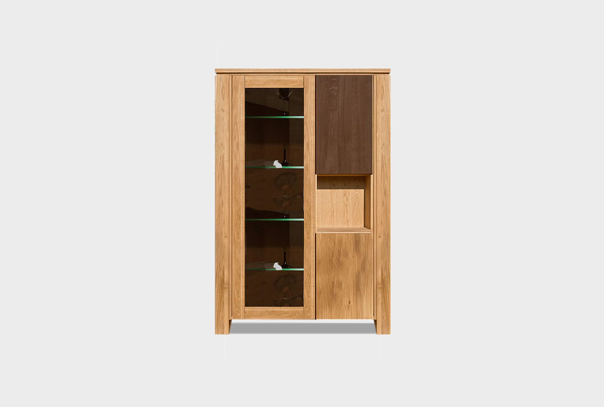 Комбинированный двухдверный шкаф с витриной «Берген» (Bergen) в цвете «бейц-масло, графит» из массива и натурального шпона дуба.