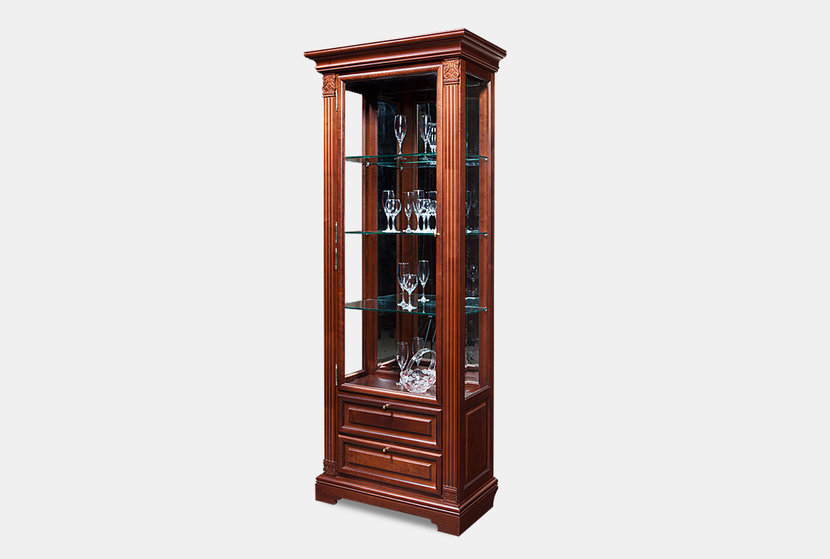Красивая посуда способна украсить любой интерьер и придать ему особое очарование. Если Вы задумались о достойном фоне для ваших сокровищ, то аккуратный шкаф для посуды "Престиж" 6 станет полноценным предметом интерьера для хранения любимых сервизов. В основе такой мебели использованы натуральные материалы (массив и шпон берёзы) и классические дизайнерские приемы. Благодаря зеркалу и боковым стенкам из стекла такой шкаф не выглядит громоздким. Модель имеет удобные ящики, которые прекрасно подойдут для хранения столовых приборов.