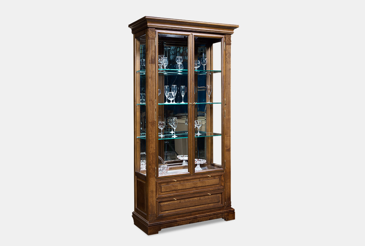 В практичном шкафу для посуды "Престиж" 7 Вы можете хранить изделия из стекла, хрусталя или фарфора. Благодаря натуральному дереву, а именно массиву берёзы, шкаф смотрится изысканно и стильно, а классический стиль, в котором он выполнен, создает не только гармоничную атмосферу в помещении, но и является признаком прекрасного вкуса. Обилие легких стеклянных элементов - полок, фацетных стекол и зеркал - избавляет от чувства громоздкости. Никогда не устареют и классические цветовые оттенки витрины