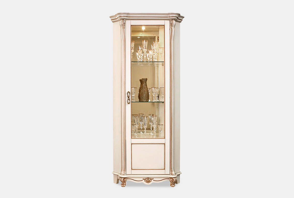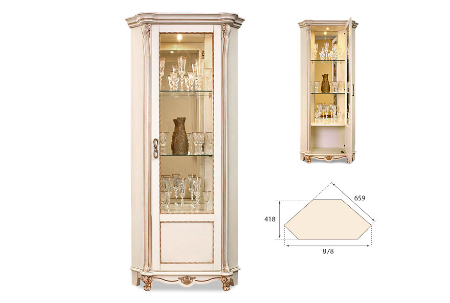 Угловой однодверный правый шкаф с витриной «Алези 10»(Alezi) станет украшением любого интерьера. Ажурные пилястры и гнутые ножки делают его облик роскошным, а инкрустация по технологии маркетри и фигурный цоколь с резьбой в виде волны придают изделию завершенный вид. Вы можете хранить в нем хрустальные бокалы: вечером включенная подсветка будет отражаться в задней зеркальной стенке шкафа и в самой посуде, создавая праздничное настроение. Декоративные элементы, выполненные в золоте и бронзе придают изделию роскошный вид и подчеркивают изысканность итальянского стиля.
