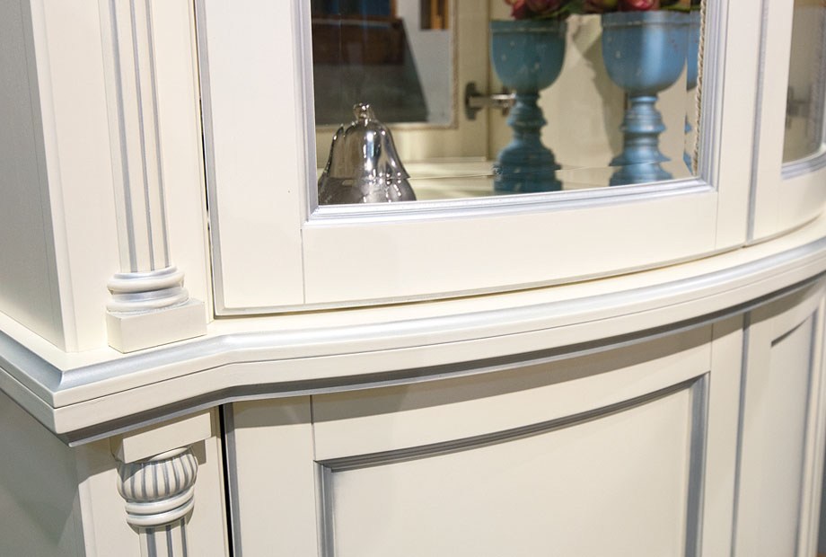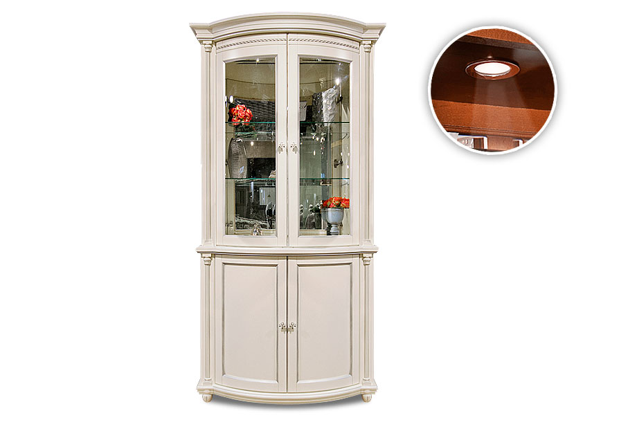 - Две съёмные стеклянные полки в верхней части витрины, одна съёмная радиусная деревянная полка в нижней части витрины.