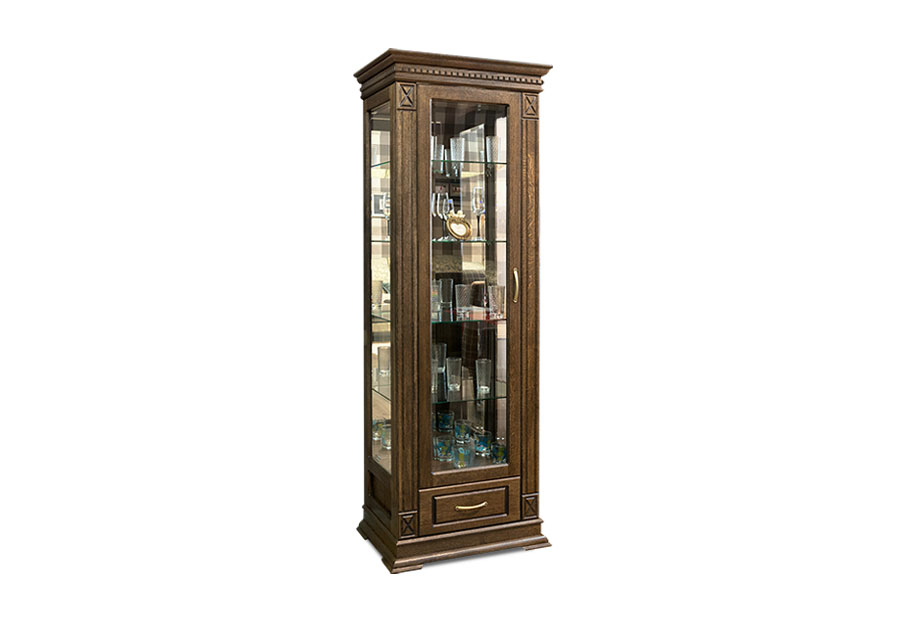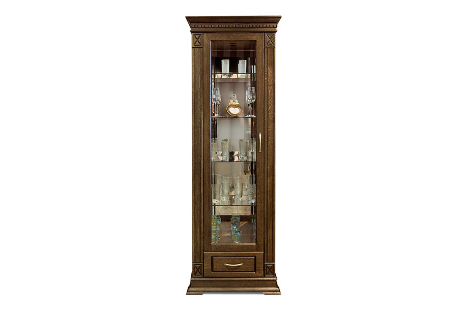Идеальным дополнением к гостиной, меблированной в классическом стиле, станет однодверный шкаф с витриной из коллекции «Верди Люкс». Несмотря на свою массивность и основательность, этот предмет мебели не займет много места в Вашей комнате, а только лишь, наоборот, станет ее украшением и изюминкой. Благородные цвета крашения вкупе с зеркальными полками и задней зеркальной поверхностью шкафа подчеркивают изысканность, свойственную классическому стилю, а декоративная резьба на пилястрах и фигурный цоколь придают шкафу утонченности и «воздушности». Вместительный выдвижной ящик делает его не только красивым, но и функциональным.