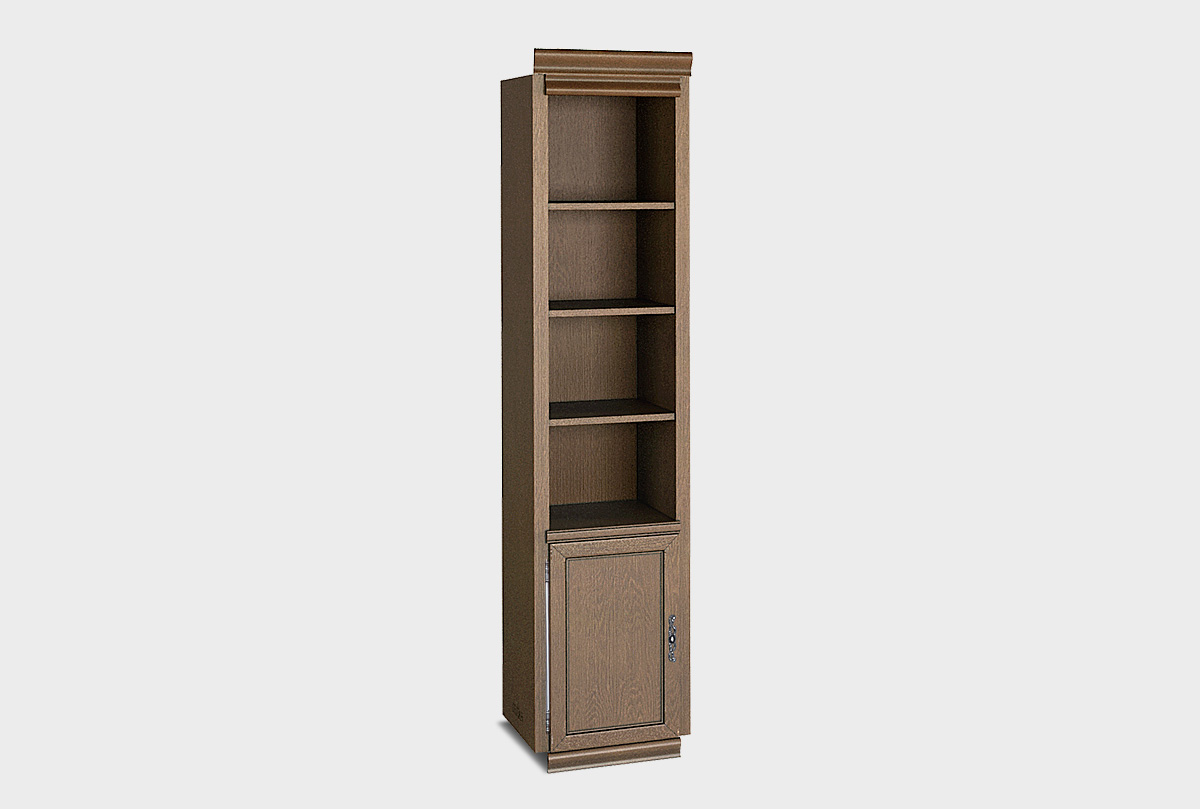 Однодверный левый стеллаж «Тэфи» в цвете «амбэр с белой патиной» из дуба станет прекрасным дополнением как к кабинету в классическом стиле, так и к гостиной или спальне.