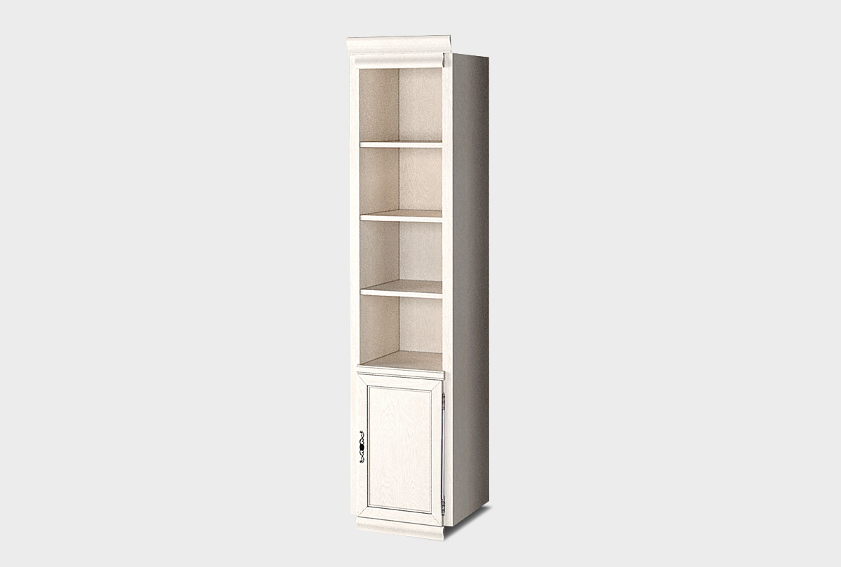 Однодверный правый стеллаж «Тэфи» в цвете «белая эмаль с темной патиной» из дуба станет прекрасным дополнением как к кабинету в классическом стиле, так и к гостиной или спальне.