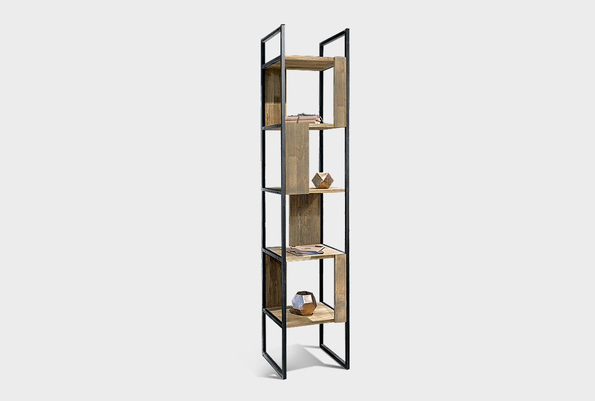 Узкий пристенный стеллаж «Арт» 430 в цвете «серый дуб, чёрный металл» с четырмя секциями из массива дуба на металлическом каркасе.