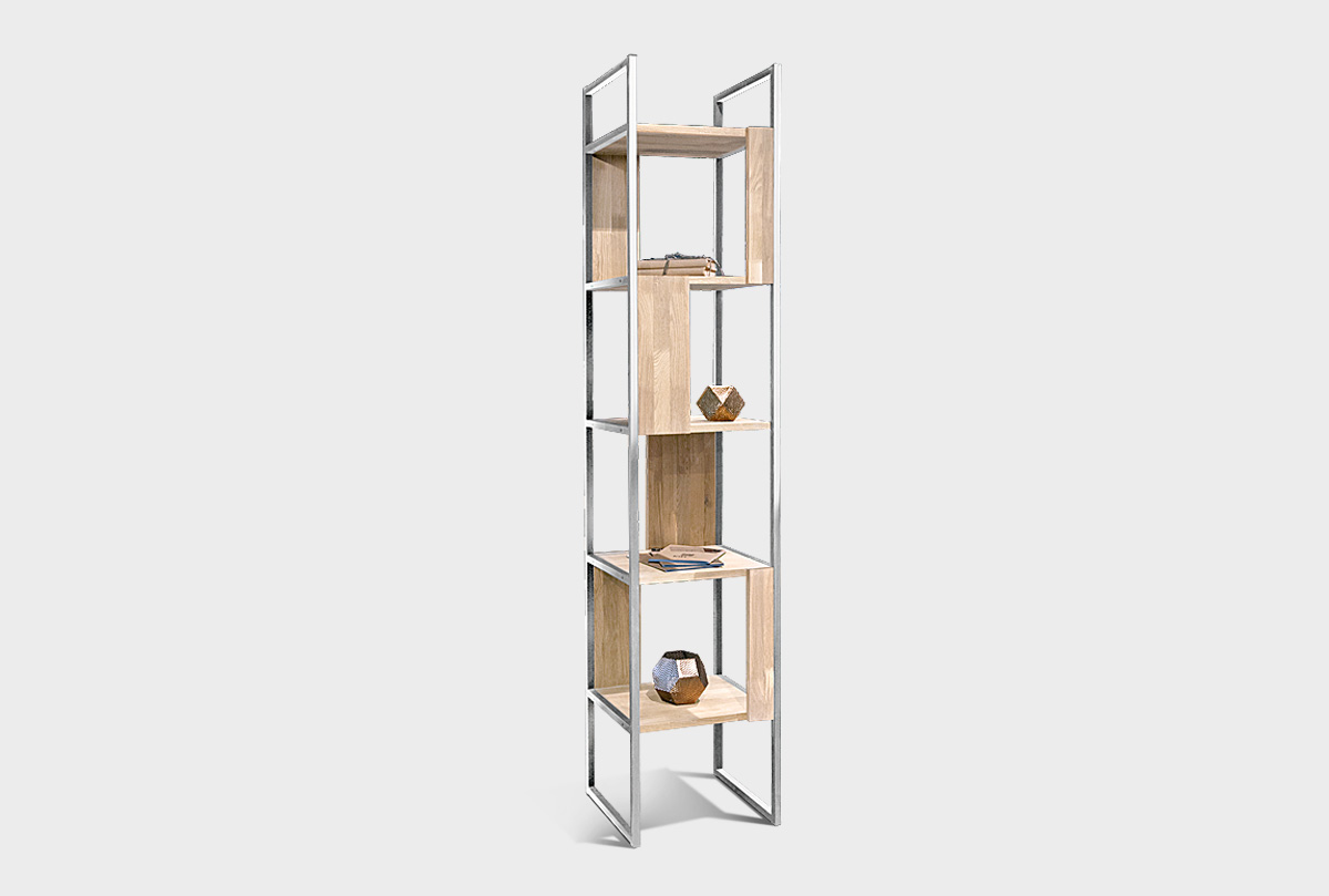 Узкий пристенный стеллаж «Арт»430 в цвете «белёный дуб, белый металл» с четырмя секциями из массива дуба на металлическом каркасе.