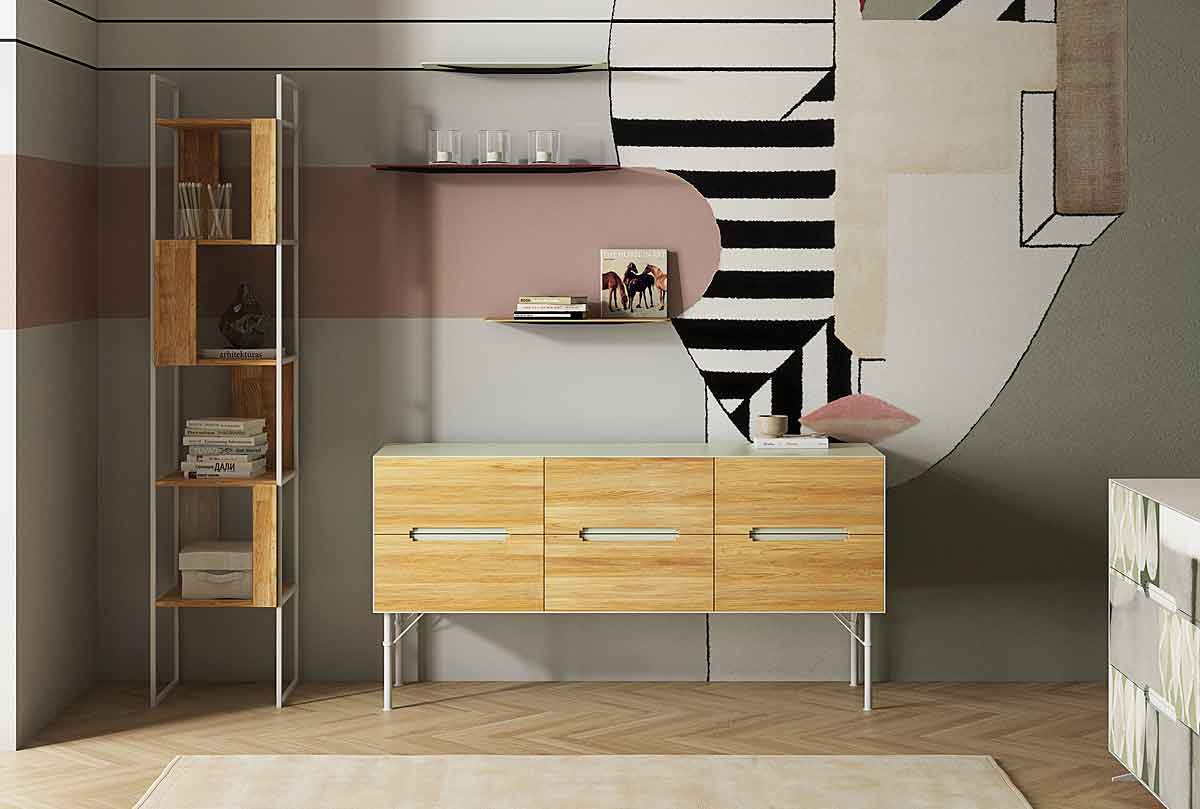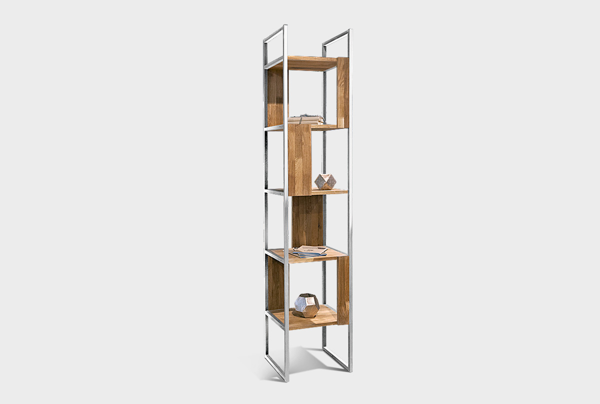 Узкий пристенный стеллаж «Арт» 430 в цвете «бейц-масло, белый металл» с четырмя секциями из массива дуба на металлическом каркасе.