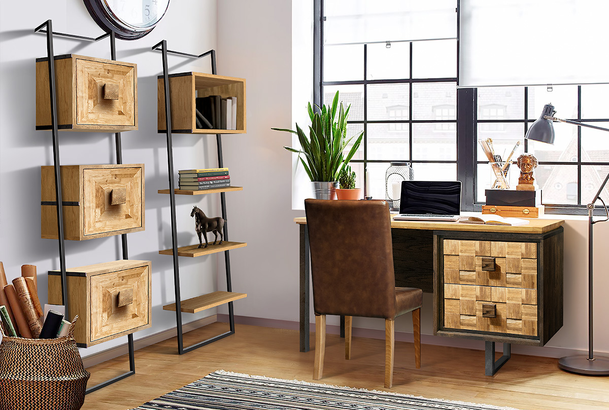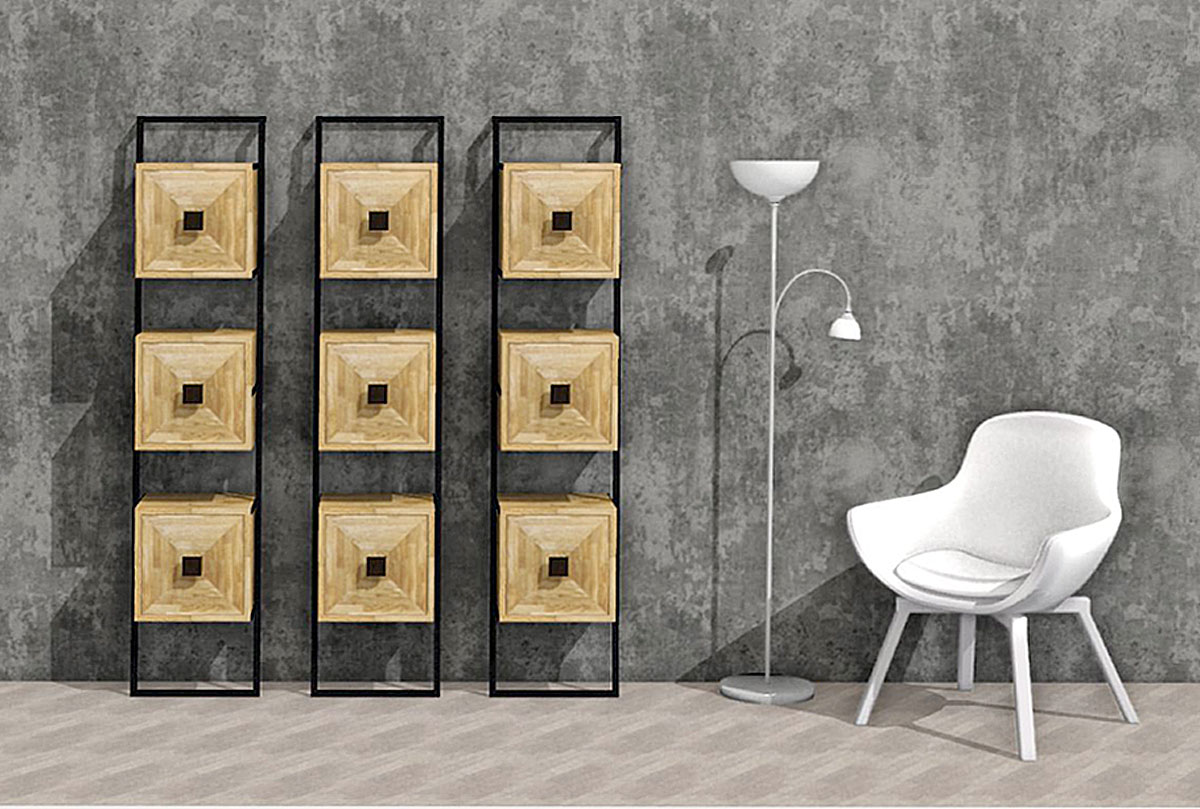 Узкий трехсекционный стеллаж «Арт» 441 в цвете «бейц-масло, чёрный металл» изготовлен из массива дуба на металлическом каркасе.