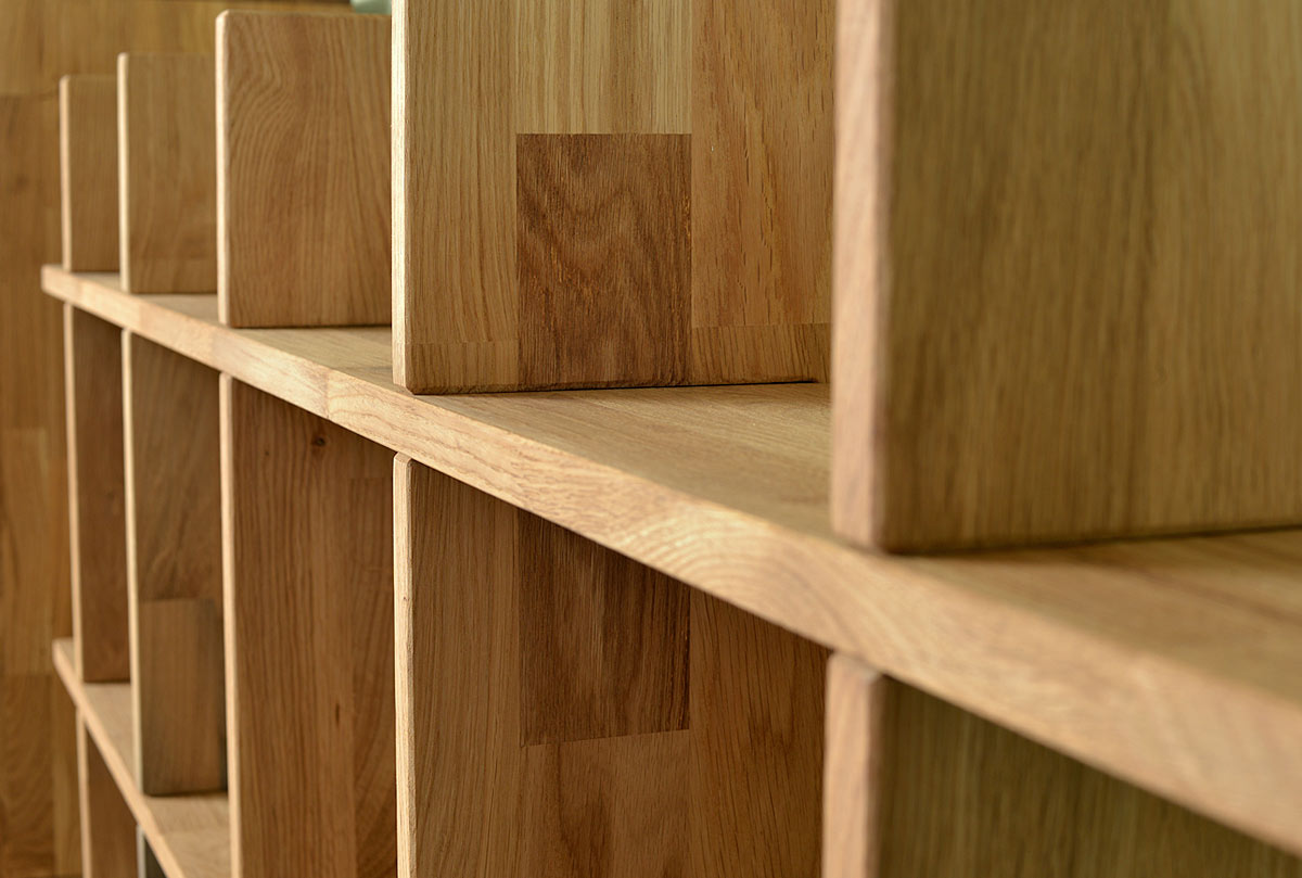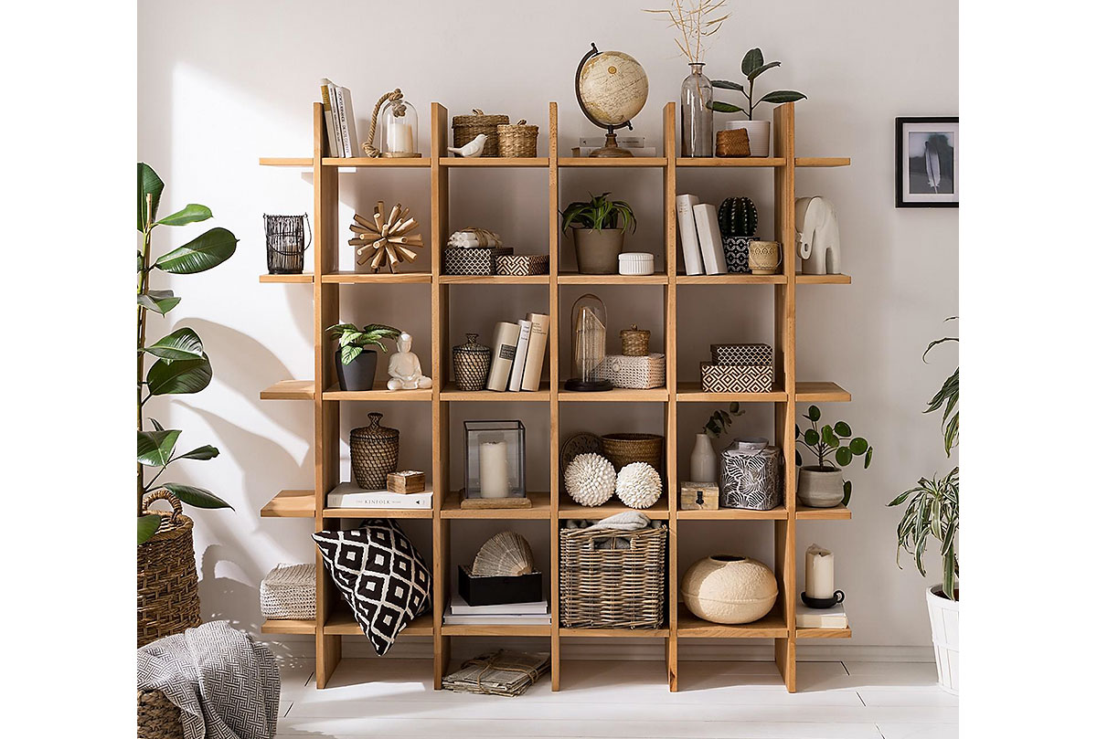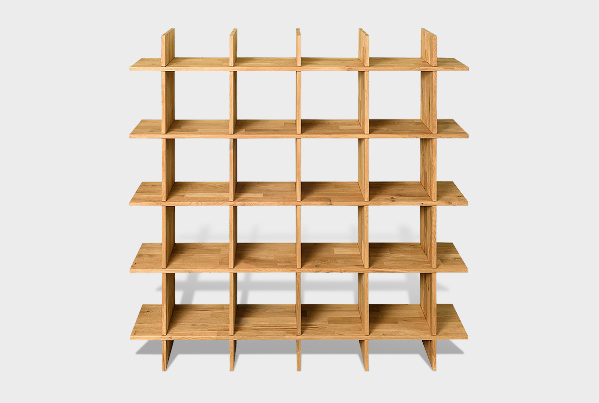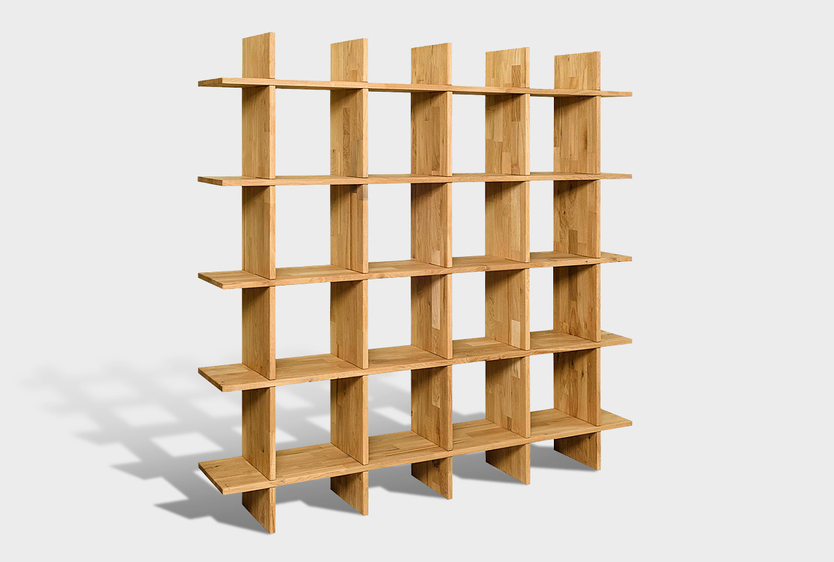 Пристенный квадратный стеллаж «Арт» 4x4 в цвете «бейц-масло» из массива дуба.