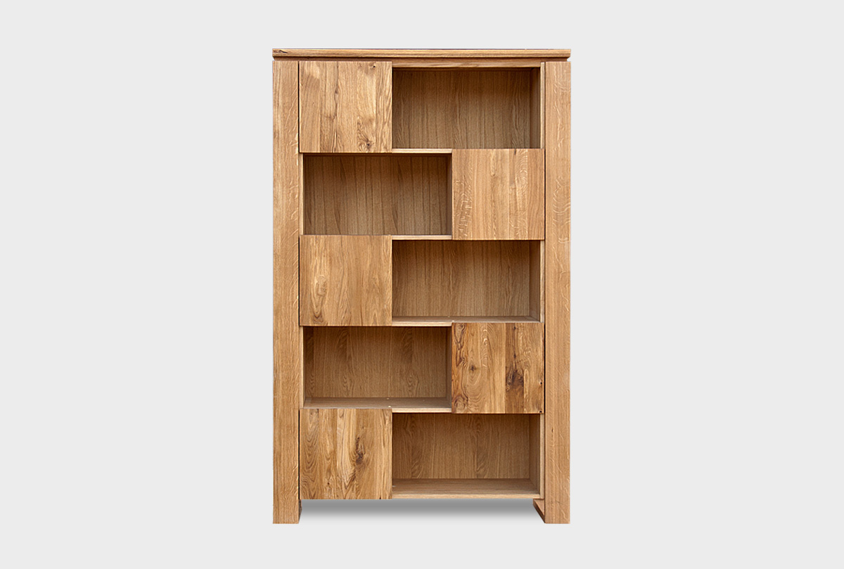 Оригинальный дизайн высокого стеллажа «Берген» В-193 в цвете «бейц-масло» воплотился в шахматной компоновке фасадов. Дверцы выполнены со специальными углублениями, которые обеспечивают удобное открывание. Стеллаж сделан из натурального дуба, обработанного бейц-маслом, благодаря чему сохранена природная структура дерева.