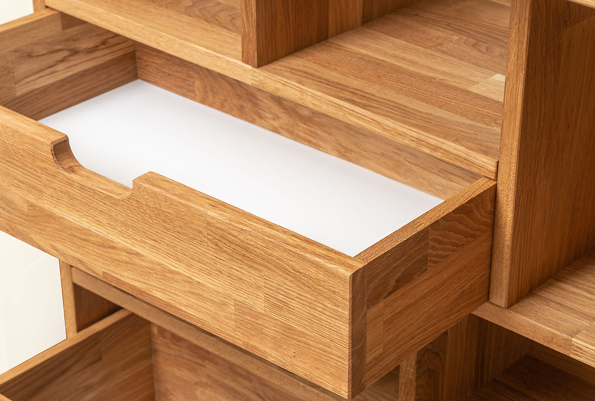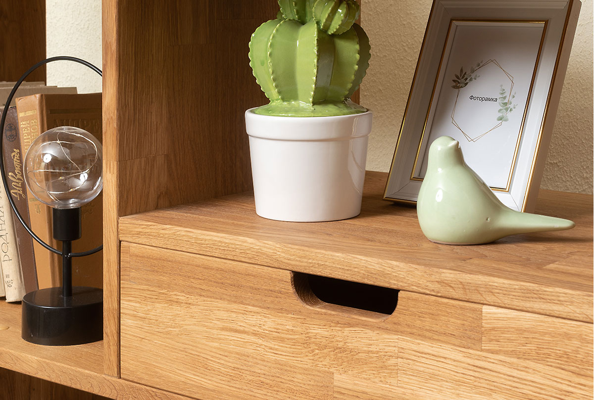 ✅ Большой нижний ящик во всю ширину стеллажа для габаритных вещей — пледов, коробов или журналов (максимальная нагрузка на выдвижной ящик 30кг).