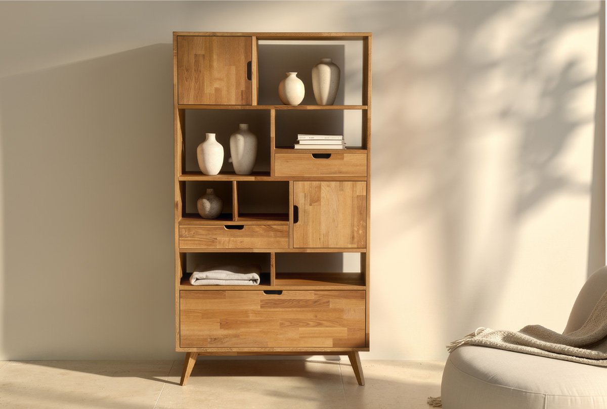 Стеллаж эффектно встраивается в гостиные, кабинеты, спальни или даже коридоры — создавая акцент и структурируя пространство. Особенно выразительно смотрится в комплекте с ТВ-тумбой, комодом или консолью из коллекции «Ирвинг»