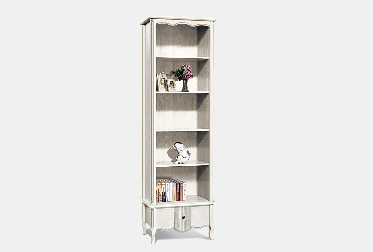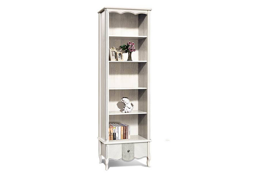 Стеллаж «Катрин» в цвете "альба с серебряной патиной" прекрасно впишется в интерьер спальни и детской. На открытых полках Вы можете расставить свои любимые книги, статуэтки и сувениры, а в выдвижном ящике хранить необходимые мелочи.
