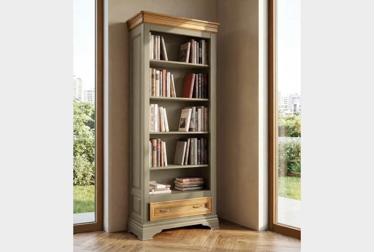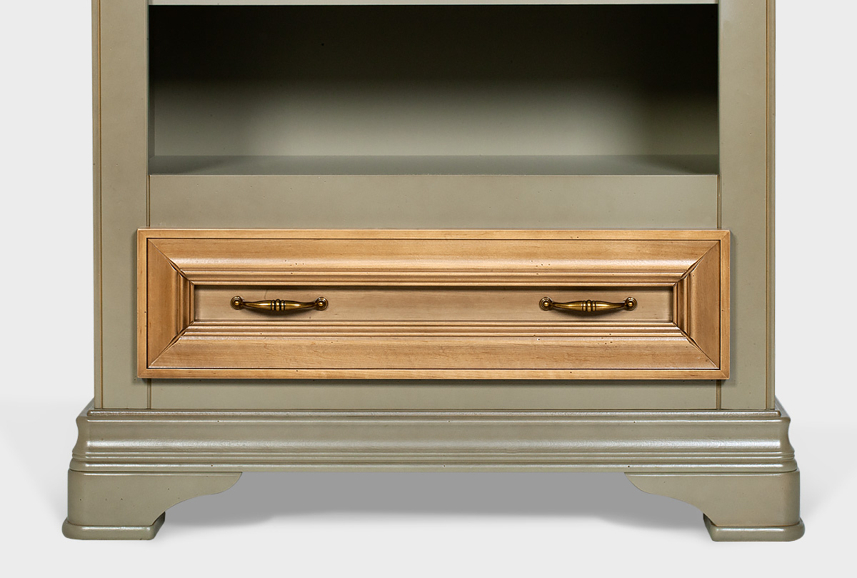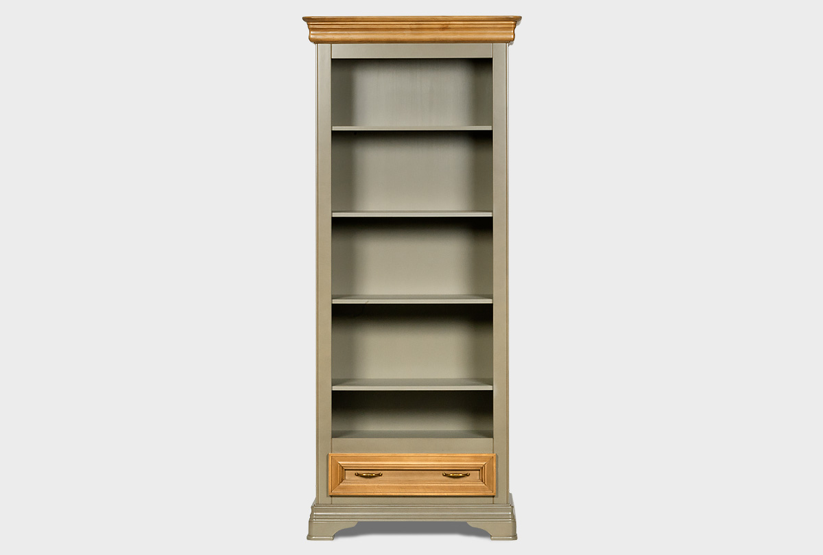 Стильный и вместительный стеллаж «Оливия» в цвете «олива» выполнен из массива и шпона ольхи. Он отлично впишется в интерьер детской или спальни. Стеллаж оснащен четырьмя полками, на которых можно удобно расположить любимые книги или игрушки, и выдвижным ящиком для хранения важных мелочей.
