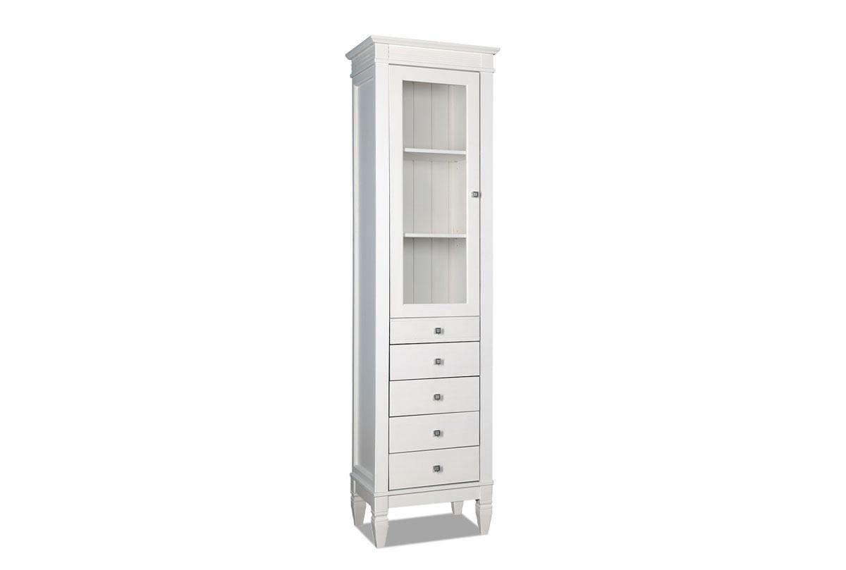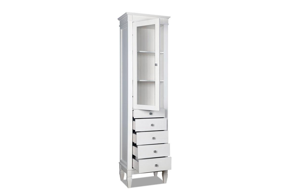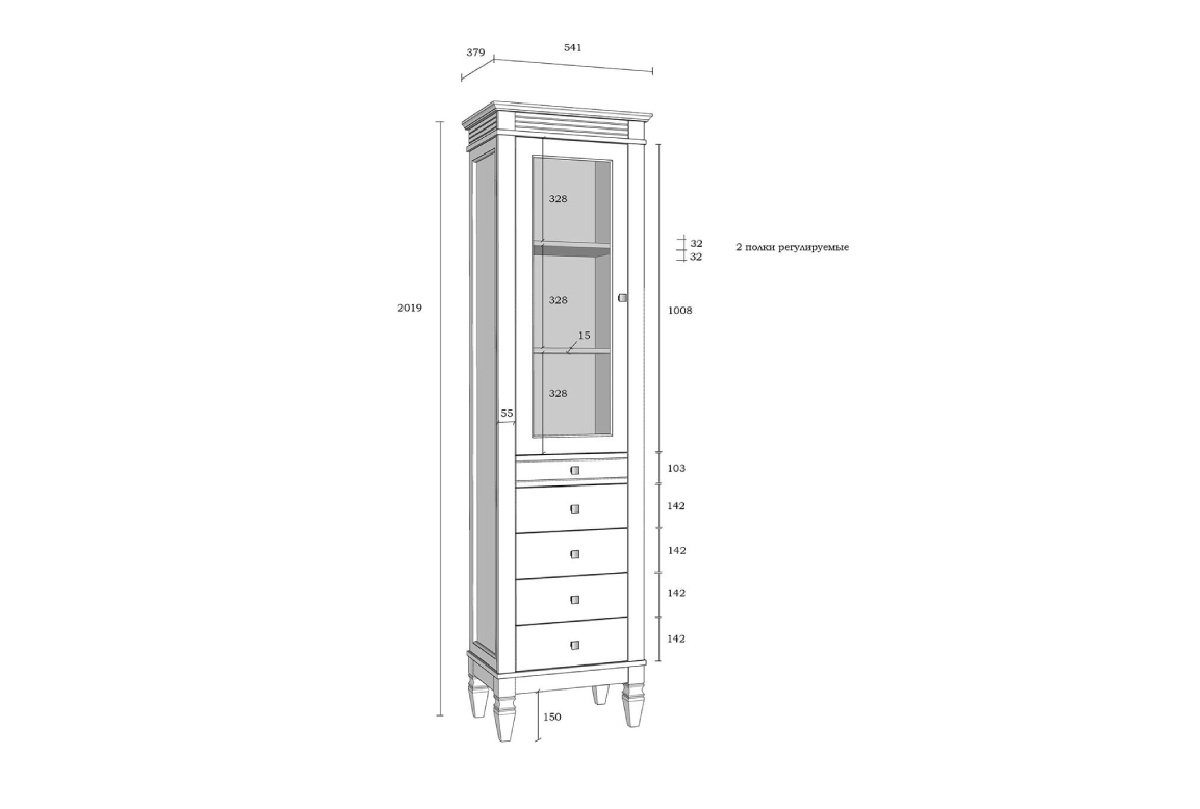 ✅Оснащен двумя полками за стеклянной дверцей и пятью выдвижными ящиками.