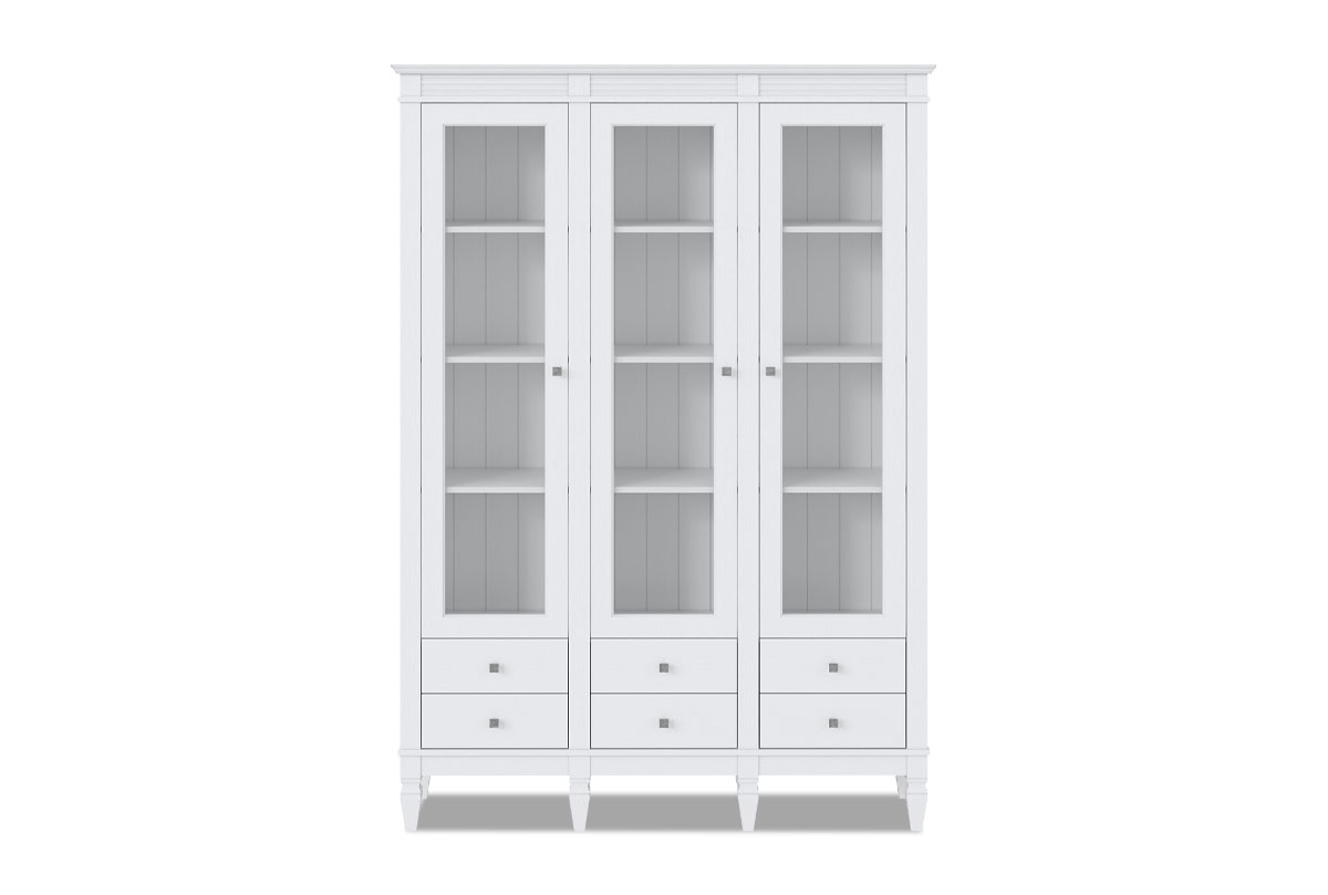 Стеллаж «Ольса» 303/006. Размеры (ШxВxГ) 1430 x 2020 x 380 мм. Выполненный из соснового массива стеллаж – для тех, кто располагает большой библиотекой, коллекцией сервизов или сувениров. Выполнен в форме витрины с распашными дверями со стеклянными вставками. Дверные петли изготовлены австрийской фирмой Blum. Ручки - итальянцами Giusti. В нижней части находятся выдвижные ящики, которыми комфортно пользоваться за счет доводчиков. Изделие подходит для многих современных стилей интерьеров, например, скандинавского или лофта.