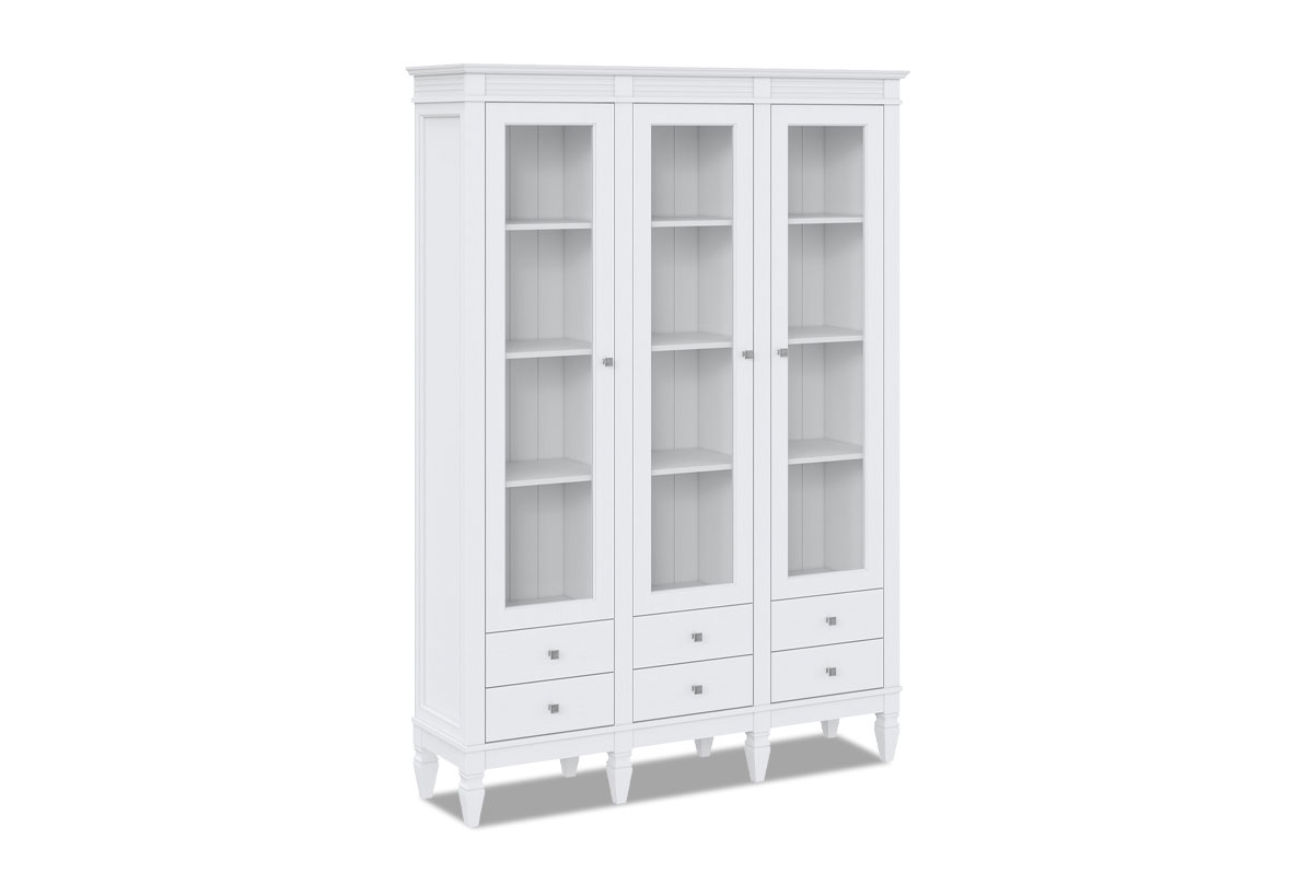 ✅ Оснащен распашными дверями со стеклянными вставками и выдвижными ящиками.