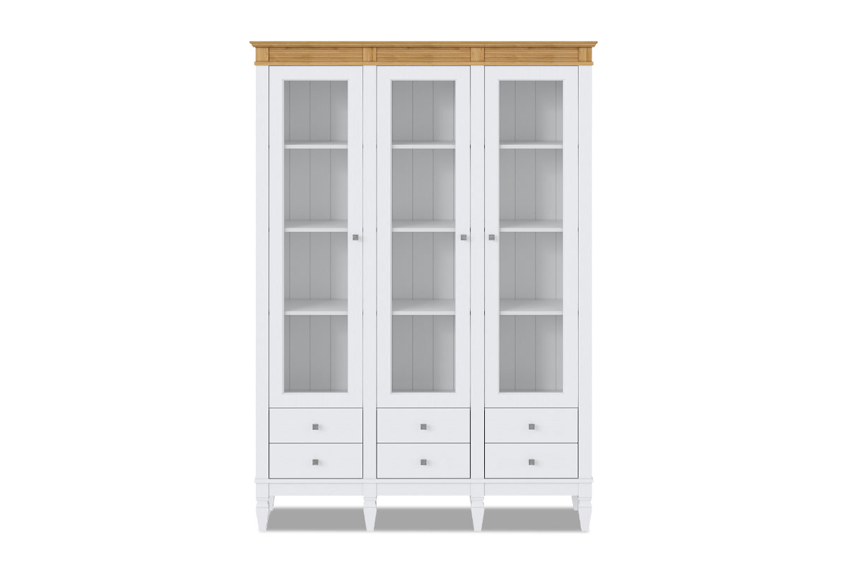 Стеллаж «Ольса» 303/006. Размеры (ШxВxГ) 1430 x 2020 x 380 мм. Выполненный из соснового массива стеллаж – для тех, кто располагает большой библиотекой, коллекцией сервизов или сувениров. Выполнен в форме витрины с распашными дверями со стеклянными вставками. Дверные петли изготовлены австрийской фирмой Blum. Ручки - итальянцами Giusti. В нижней части находятся выдвижные ящики, которыми комфортно пользоваться за счет доводчиков. Изделие подходит для многих современных стилей интерьеров, например, скандинавского или лофта.