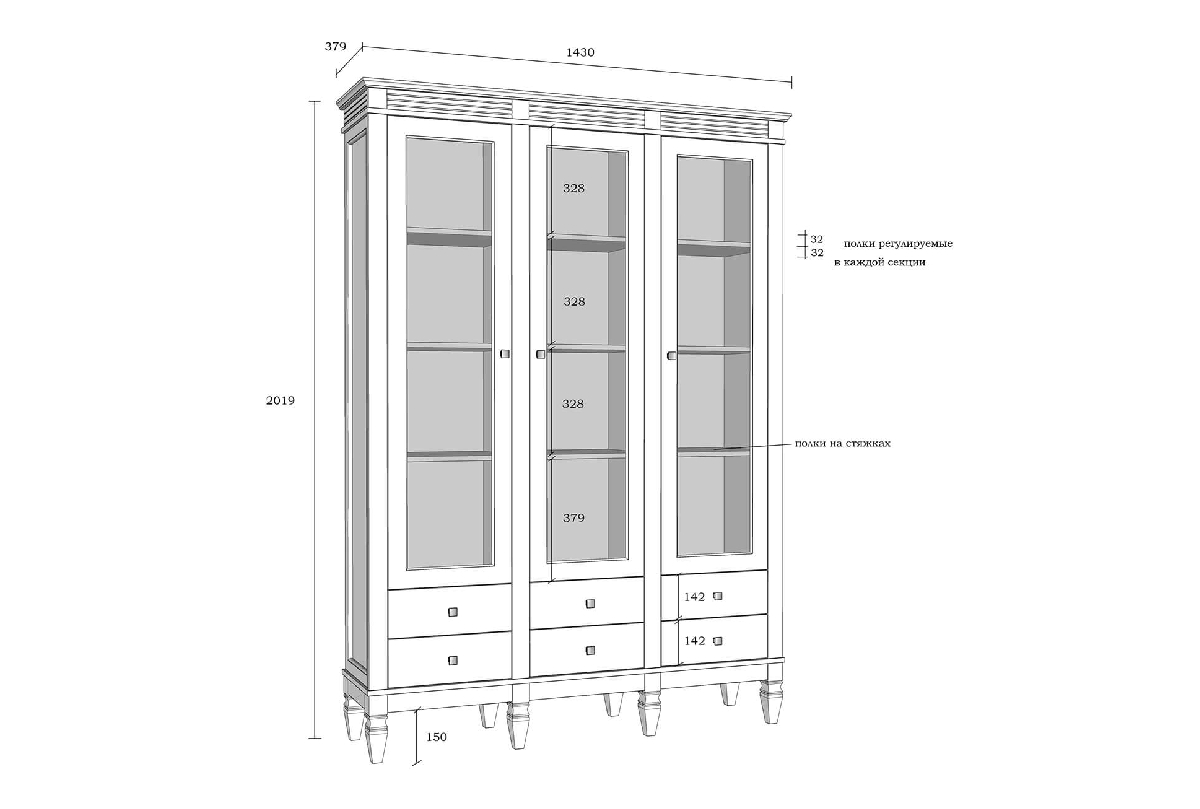 ✅ Разделен на три вертикальных секции, в каждой из которых три полки.