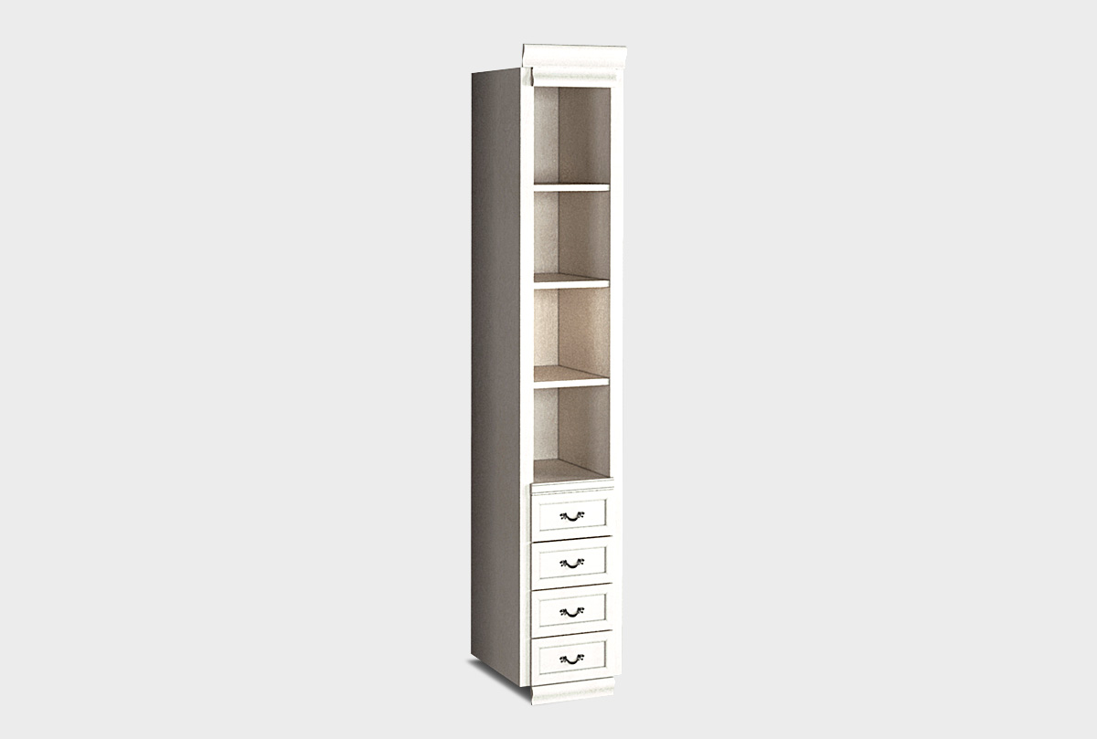 Стеллаж с ящиками «Тэфи» в цвете «белая эмаль с темной патиной» из массива и шпона дуба станет прекрасным дополнением как к кабинету в классическом стиле, так и к гостиной или спальне.